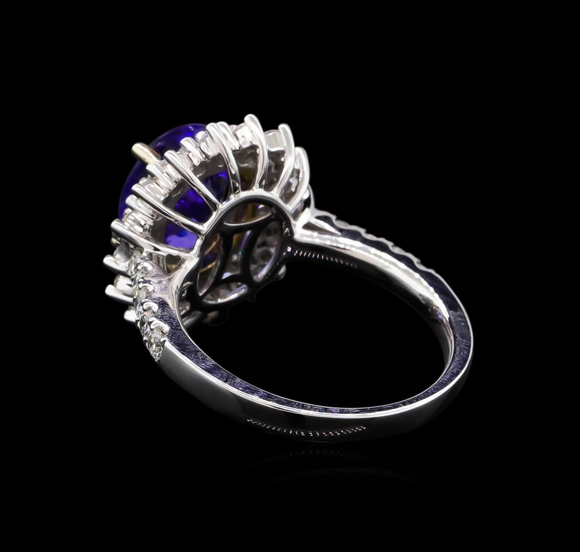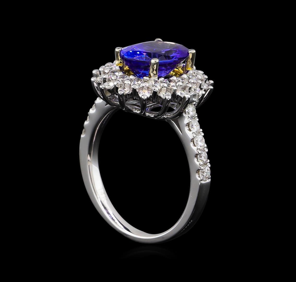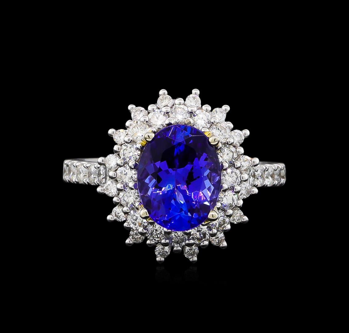 One electronically tested 14KT white and yellow gold Ladies combination cast & assembled ring with a bright polish finish. Condition is new. Identified with markings of "14K". Containing: One prong set oval modified brilliant cut natural tanzanite, measuring 10.10 x 7.50 x 4.88mm, exact weight 2.83ct., clarity is eye clean, type I, medium, very slightly grayish, bluish violet color, (GIA bV 5/3), cut is very good. Colored gemstones are presumed to have been subjected to commonly used color/clarity enhancement processes. Twenty-Six prong set round brilliant cut diamonds, measuring 2.00 - 2.00 x 1.20mm (depth est.) approximate. Total Weight of 26 Stones = 0.89ct. Clarity: SI-1 to I-1. Color: H - I, Cut is Good. Sixteen prong set round brilliant cut diamonds, measuring 1.50 - 1.50 x 0.90mm (depth est.) approximate. Total Weight of 16 Stones = 0.24ct. Clarity: I-1 to I-2. Color: I - J, Cut is Good. Total Weight of Colored Stones 2.83ct. Total Weight of Diamonds 1.13ct. Total Weight of Ring 6.10 grams. GGL Appraised at $8,585.00.
