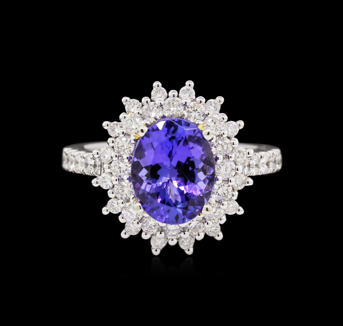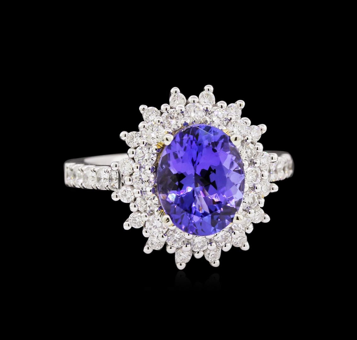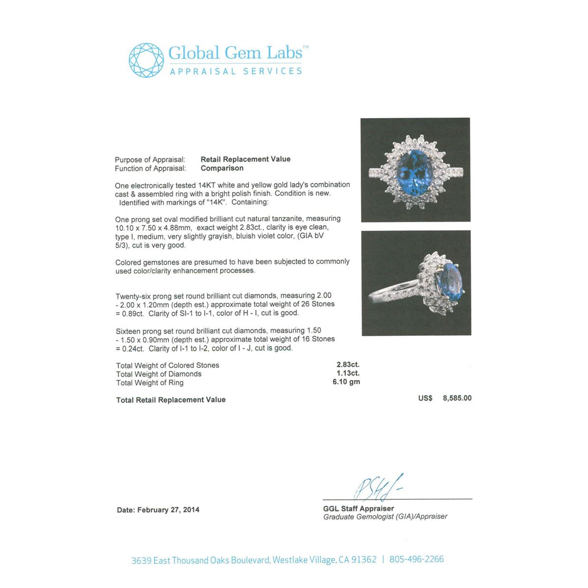 One electronically tested 14KT white and yellow gold Ladies combination cast & assembled ring with a bright polish finish. Condition is new. Identified with markings of "14K". Containing: One prong set oval modified brilliant cut natural tanzanite, measuring 10.10 x 7.50 x 4.88mm, exact weight 2.83ct., clarity is eye clean, type I, medium, very slightly grayish, bluish violet color, (GIA bV 5/3), cut is very good. Colored gemstones are presumed to have been subjected to commonly used color/clarity enhancement processes. Twenty-Six prong set round brilliant cut diamonds, measuring 2.00 - 2.00 x 1.20mm (depth est.) approximate. Total Weight of 26 Stones = 0.89ct. Clarity: SI-1 to I-1. Color: H - I, Cut is Good. Sixteen prong set round brilliant cut diamonds, measuring 1.50 - 1.50 x 0.90mm (depth est.) approximate. Total Weight of 16 Stones = 0.24ct. Clarity: I-1 to I-2. Color: I - J, Cut is Good. Total Weight of Colored Stones 2.83ct. Total Weight of Diamonds 1.13ct. Total Weight of Ring 6.10 grams. GGL Appraised at $8,585.00.