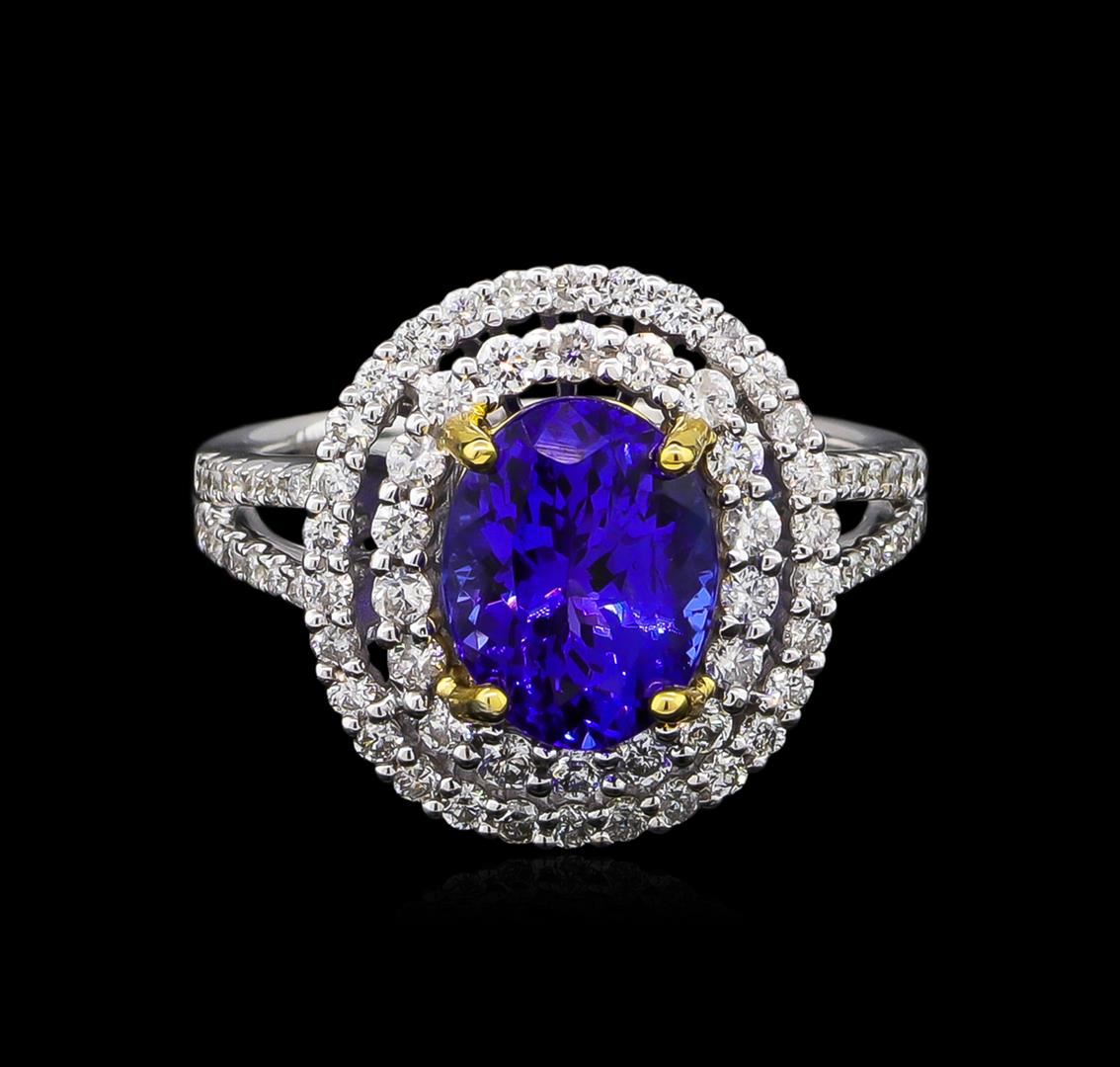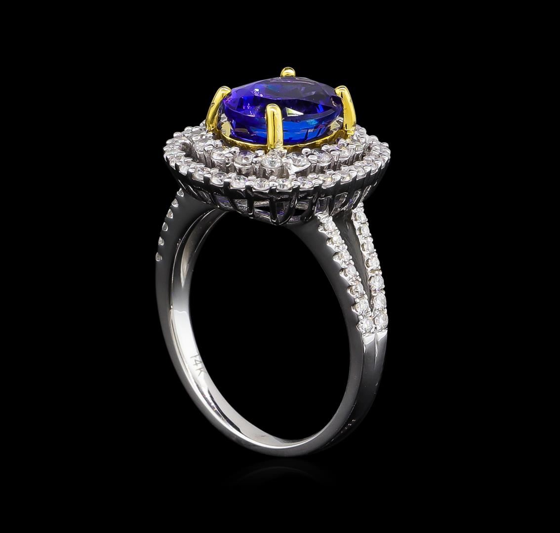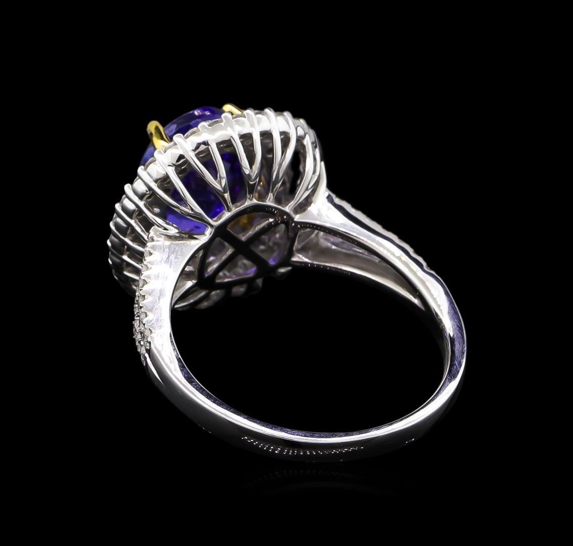 One electronically tested 14KT white and yellow gold Ladies combination cast & assembled ring with a bright polish finish. Condition is new. Identified with markings of "14K". Containing: One prong set oval modified brilliant cut natural tanzanite, measuring 9.80 x 7.60 x 4.94mm, exact weight 3.20ct., clarity is eye clean, type I, medium, moderately strong, bluish violet color, (GIA bV 5/4), cut is very good. Colored gemstones are presumed to have been subjected to commonly used color/clarity enhancement processes. Fifty-Eight prong set round brilliant cut diamonds, measuring 1.10 - 1.10 x 0.66mm (depth est.) approximate. Total Weight of 58 Stones = 0.49ct. Clarity: I-1 to I-2. Color: I - J, Cut is Good. Eighteen prong set round brilliant cut diamonds, measuring 1.50 - 1.50 x 0.90mm (depth est.) approximate. Total Weight of 18 Stones = 0.50ct. Clarity: I-1 to I-2. Color: I - J, Cut is Good.. Total Weight of Colored Stones 3.20ct. Total Weight of Diamonds 0.99ct. Total Weight of Ring 5.60 grams. GGL Appraised at $7,400.00.