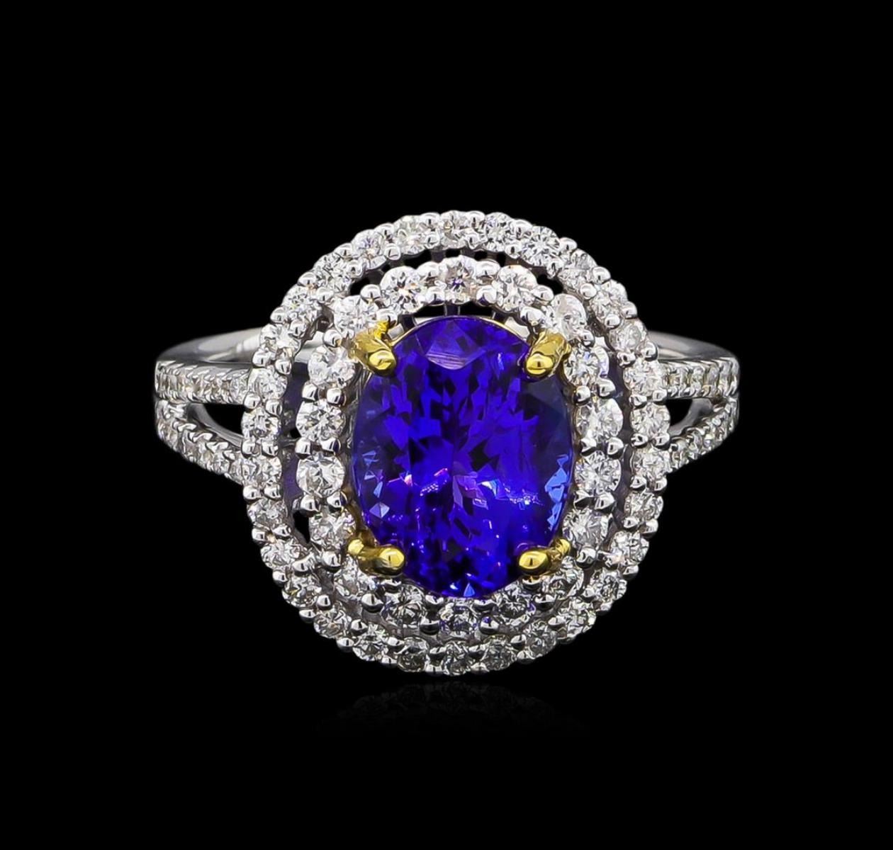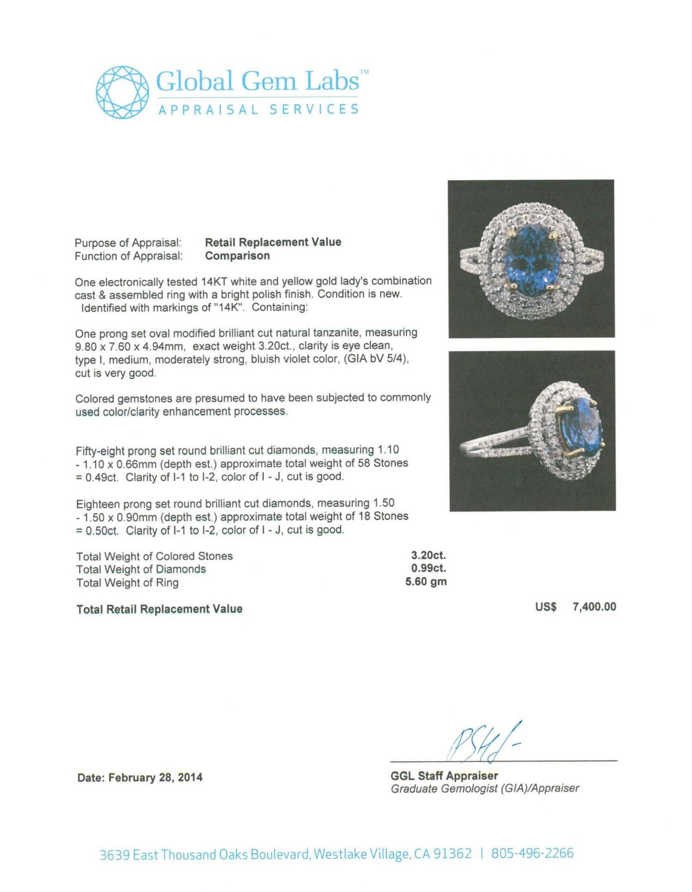 One electronically tested 14KT white and yellow gold Ladies combination cast & assembled ring with a bright polish finish. Condition is new. Identified with markings of "14K". Containing: One prong set oval modified brilliant cut natural tanzanite, measuring 9.80 x 7.60 x 4.94mm, exact weight 3.20ct., clarity is eye clean, type I, medium, moderately strong, bluish violet color, (GIA bV 5/4), cut is very good. Colored gemstones are presumed to have been subjected to commonly used color/clarity enhancement processes. Fifty-Eight prong set round brilliant cut diamonds, measuring 1.10 - 1.10 x 0.66mm (depth est.) approximate. Total Weight of 58 Stones = 0.49ct. Clarity: I-1 to I-2. Color: I - J, Cut is Good. Eighteen prong set round brilliant cut diamonds, measuring 1.50 - 1.50 x 0.90mm (depth est.) approximate. Total Weight of 18 Stones = 0.50ct. Clarity: I-1 to I-2. Color: I - J, Cut is Good.. Total Weight of Colored Stones 3.20ct. Total Weight of Diamonds 0.99ct. Total Weight of Ring 5.60 grams. GGL Appraised.