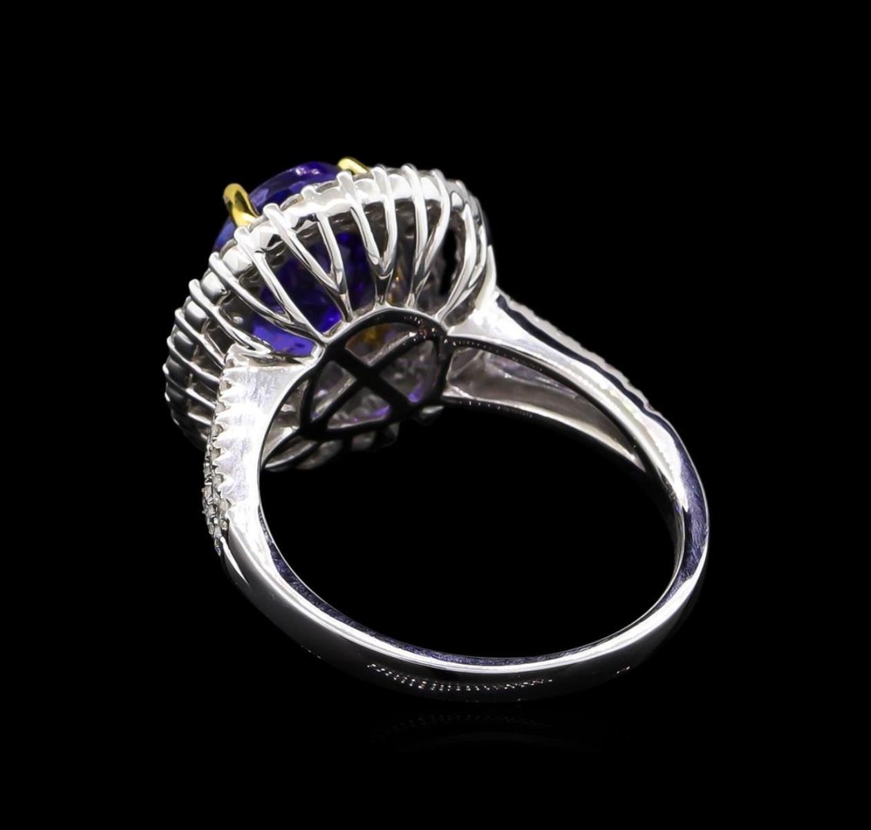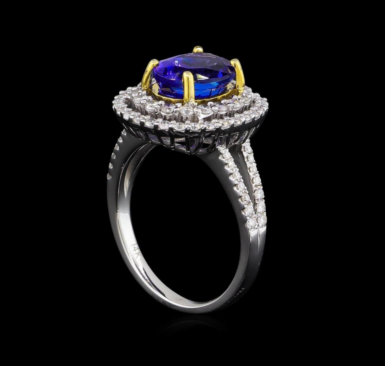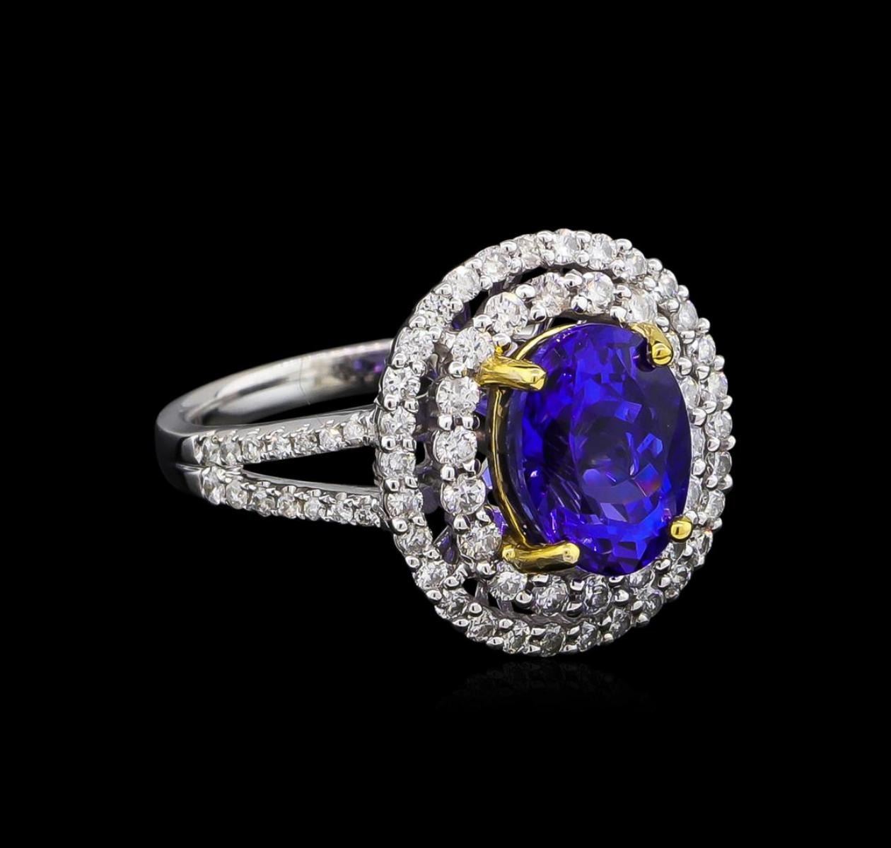 One electronically tested 14KT white and yellow gold Ladies combination cast & assembled ring with a bright polish finish. Condition is new. Identified with markings of "14K". Containing: One prong set oval modified brilliant cut natural tanzanite, measuring 9.80 x 7.60 x 4.94mm, exact weight 3.20ct., clarity is eye clean, type I, medium, moderately strong, bluish violet color, (GIA bV 5/4), cut is very good. Colored gemstones are presumed to have been subjected to commonly used color/clarity enhancement processes. Fifty-Eight prong set round brilliant cut diamonds, measuring 1.10 - 1.10 x 0.66mm (depth est.) approximate. Total Weight of 58 Stones = 0.49ct. Clarity: I-1 to I-2. Color: I - J, Cut is Good. Eighteen prong set round brilliant cut diamonds, measuring 1.50 - 1.50 x 0.90mm (depth est.) approximate. Total Weight of 18 Stones = 0.50ct. Clarity: I-1 to I-2. Color: I - J, Cut is Good.. Total Weight of Colored Stones 3.20ct. Total Weight of Diamonds 0.99ct. Total Weight of Ring 5.60 grams. GGL Appraised.