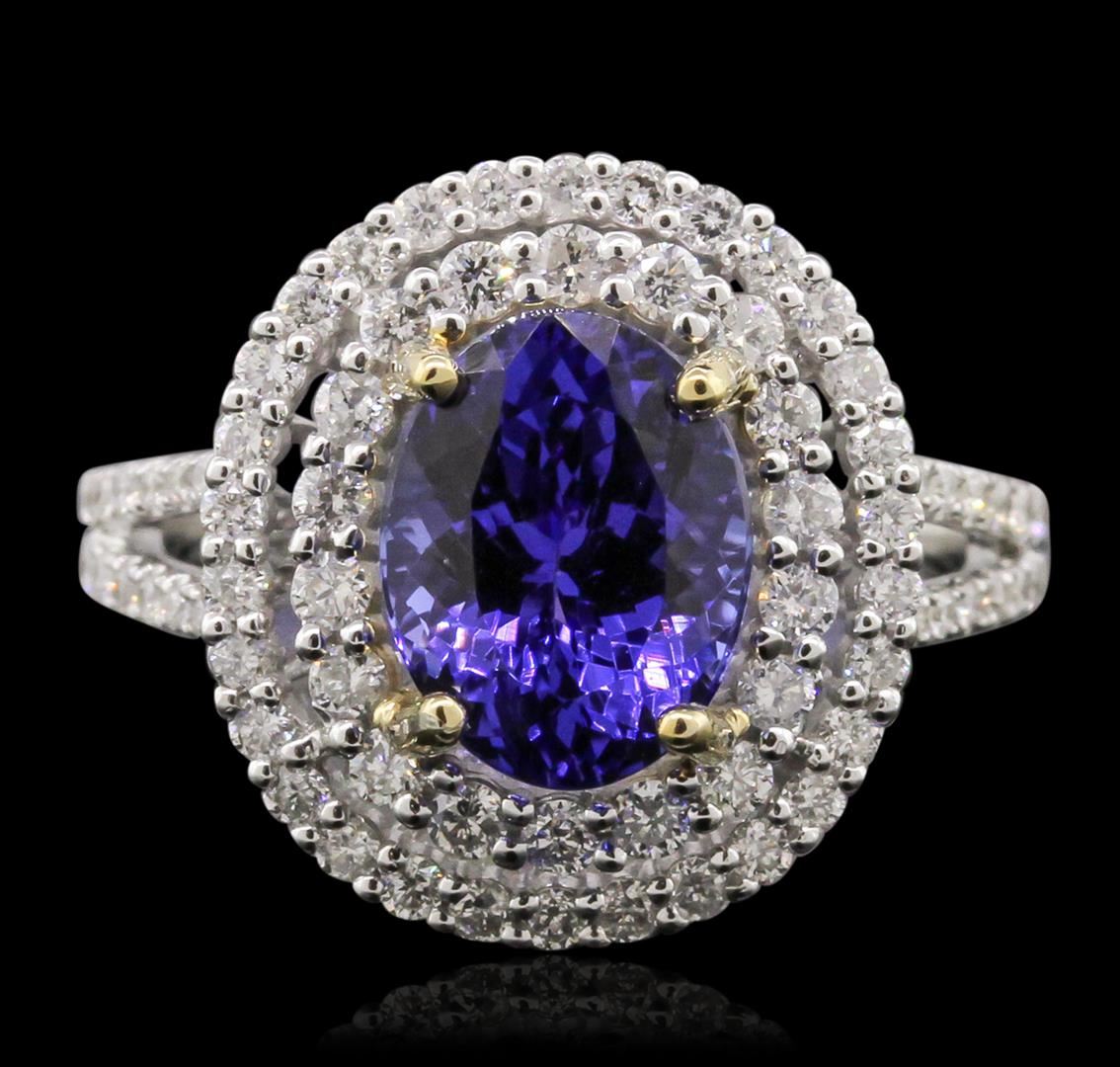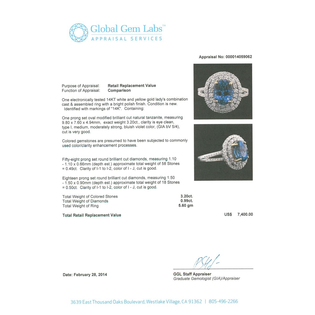 One electronically tested 14KT white and yellow gold Ladies combination cast & assembled ring with a bright polish finish. Condition is new. Identified with markings of "14K". Containing: One prong set oval modified brilliant cut natural tanzanite, measuring 9.80 x 7.60 x 4.94mm, exact weight 3.20ct., clarity is eye clean, type I, medium, moderately strong, bluish violet color, (GIA bV 5/4), cut is very good. Colored gemstones are presumed to have been subjected to commonly used color/clarity enhancement processes. Fifty-Eight prong set round brilliant cut diamonds, measuring 1.10 - 1.10 x 0.66mm (depth est.) approximate. Total Weight of 58 Stones = 0.49ct. Clarity: I-1 to I-2. Color: I - J, Cut is Good. Eighteen prong set round brilliant cut diamonds, measuring 1.50 - 1.50 x 0.90mm (depth est.) approximate. Total Weight of 18 Stones = 0.50ct. Clarity: I-1 to I-2. Color: I - J, Cut is Good.. Total Weight of Colored Stones 3.20ct. Total Weight of Diamonds 0.99ct. Total Weight of Ring 5.60 grams. GGL Appraised at $7,400.00.