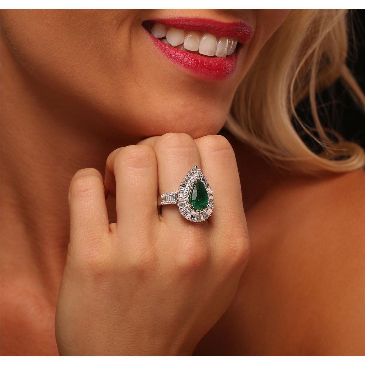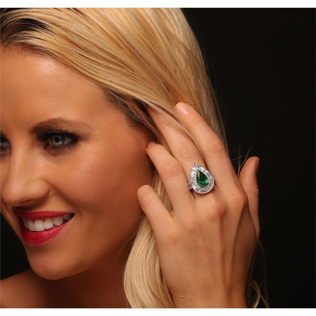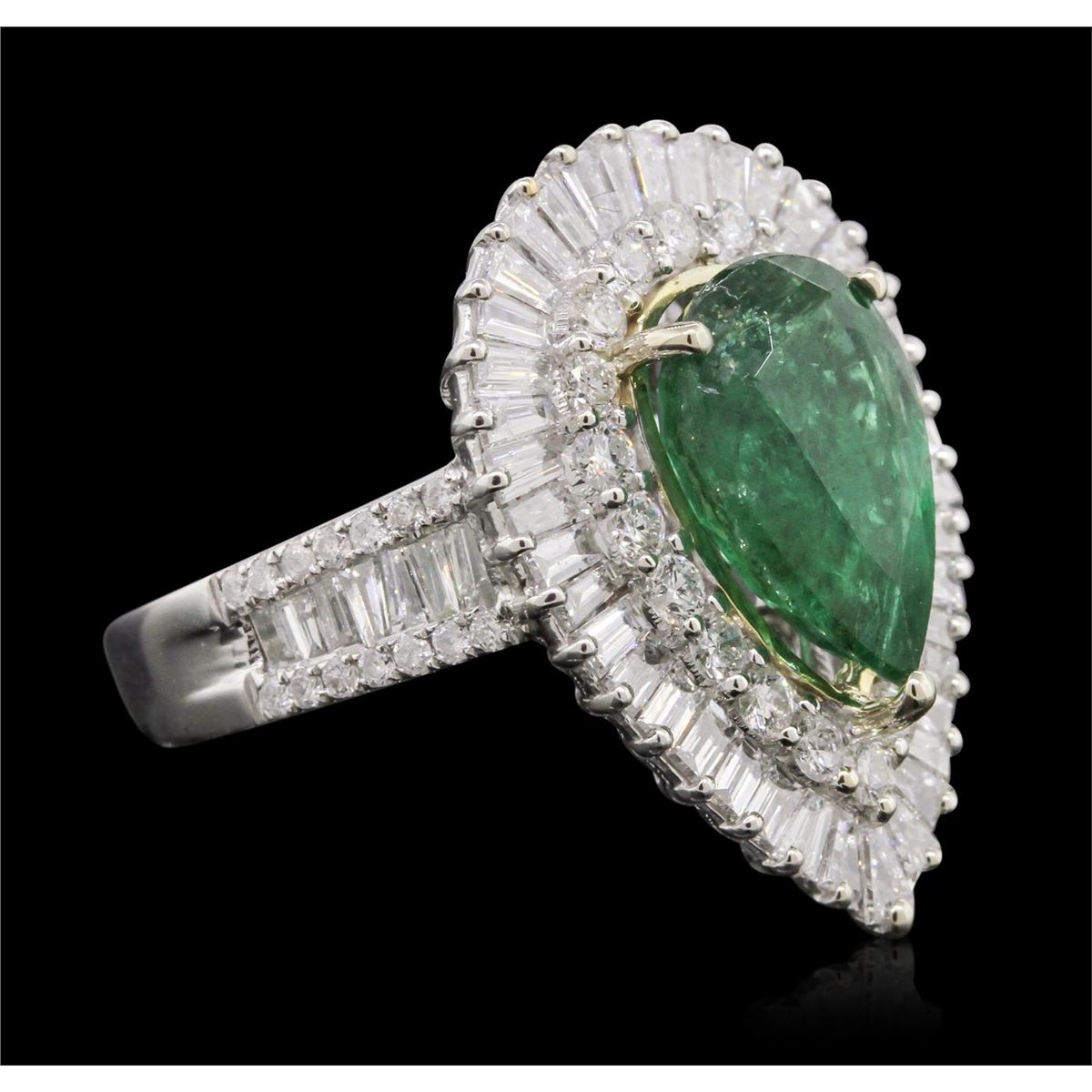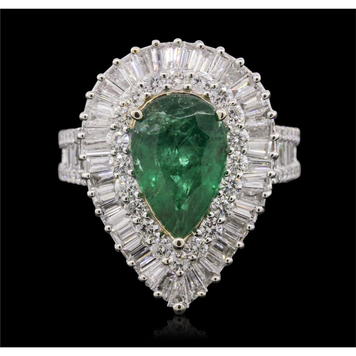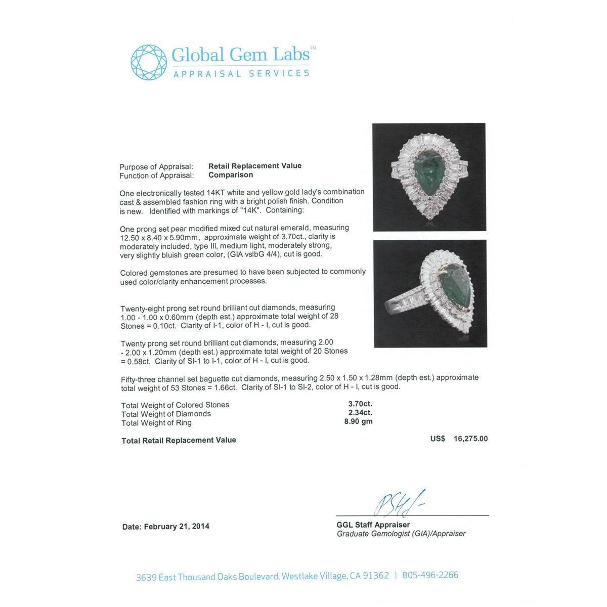 One electronically tested 14KT white and yellow gold Ladies combination cast & assembled fashion ring with a bright polish finish. Condition is new. Identified with markings of "14K". Containing: One prong set pear modified mixed cut natural emerald, measuring 12.50 x 8.40 x 5.90mm, approximate weight of 3.70ct., clarity is moderately included, type III, medium light, moderately strong, very slightly bluish green color, (GIA vslbG 4/4), cut is good. Colored gemstones are presumed to have been subjected to commonly used color/clarity enhancement processes. Twenty-Eight prong set round brilliant cut diamonds, measuring 1.00 - 1.00 x 0.60mm (depth est.) approximate. Total Weight of 28 Stones = 0.10ct. Clarity: I-1. Color: H - I, Cut is Good. Twenty prong set round brilliant cut diamonds, measuring 2.00 - 2.00 x 1.20mm (depth est.) approximate. Total Weight of 20 Stones = 0.58ct. Clarity: SI-1 to I-1. Color: H - I, Cut is Good. Fifty-Three channel set baguette cut diamonds, measuring 2.50 x 1.50 x 1.28mm (depth est.) approximate. Total Weight of 53 Stones = 1.66ct. Clarity: SI-1 to SI-2. Color: H - I, Cut is Good. Total Weight of Colored Stones 3.70ct. Total Weight of Diamonds 2.34ct. Total Weight of Ring 8.90 grams. GGL Appraised at $16,275.00.
