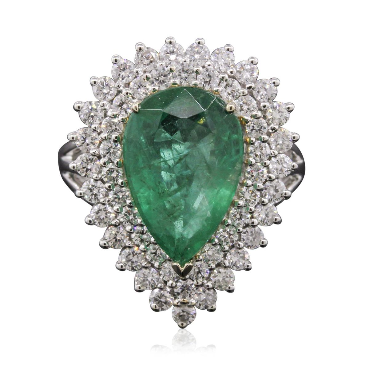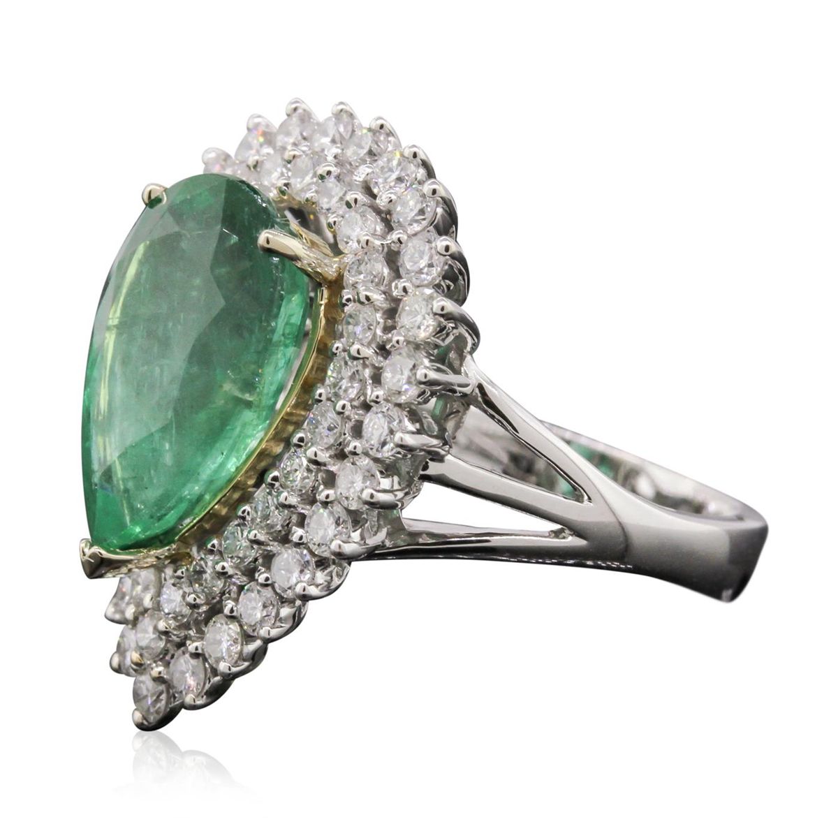 One electronically tested 14KT white and yellow gold Ladies combination cast & assembled fashion ring with a bright polish finish. Condition is new. Identified with markings of "14K". Containing: One prong set pear modified mixed cut natural emerald, measuring 14.70 x 10.10 x 6.00mm, approximate weight of 5.54ct., clarity is moderately included, type III, medium, moderately strong, very slightly bluish green color, (GIA vslbG 5/4), cut is good. Colored gemstones are presumed to have been subjected to commonly used and possible undetectable color/clarity enhancement processes. Twenty-Five prong set round brilliant cut diamonds, measuring 1.70 - 1.70 x 1.02mm (depth est.) approximate. Total Weight of 25 Stones = 0.45ct. Clarity: SI-2 to I-1. Color: H - I, Cut is Good. Twenty-Seven prong set round brilliant cut diamonds, measuring 2.50 - 2.50 x 1.50mm (depth est.) approximate. Total Weight of 27 Stones = 1.46ct. Clarity: SI-2 to I-1. Color: H - I, Cut is Good. Total Weight of Colored Stones 5.54ct. Total Weight of Diamonds 1.91ct. Total Weight of Ring 9.70 grams. GGL Appraised at $19,255.00.