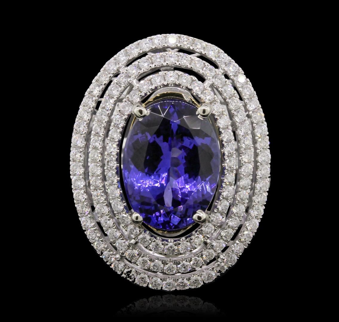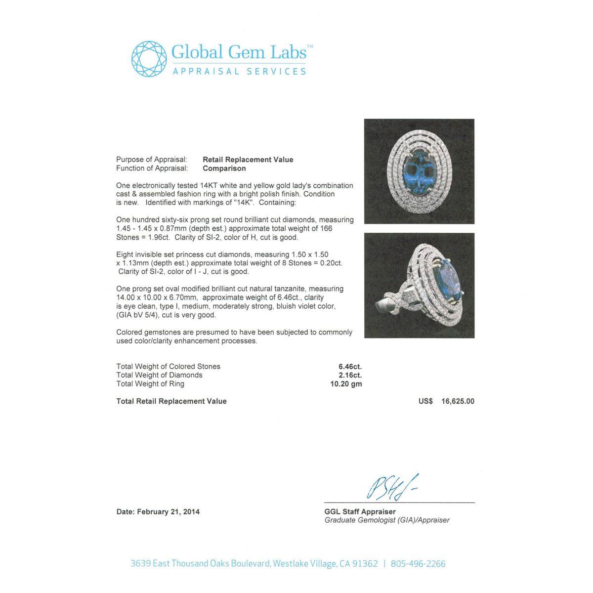 One electronically tested 14KT white and yellow gold Ladies combination cast & assembled fashion ring with a bright polish finish. Condition is new. Identified with markings of "14K". Containing: One Hundred Sixty-Six prong set round brilliant cut diamonds, measuring 1.45 - 1.45 x 0.87mm (depth est.) approximate. Total Weight of 166 Stones = 1.96ct. Clarity: SI-2. Color: H, Cut is Good. Eight invisible set princess cut diamonds, measuring 1.50 x 1.50 x 1.13mm (depth est.) approximate. Total Weight of 8 Stones = 0.20ct. Clarity: SI-2. Color: I - J, Cut is Good. One prong set oval modified brilliant cut natural tanzanite, measuring 14.00 x 10.00 x 6.70mm, approximate weight of 6.46ct., clarity is eye clean, type I, medium, moderately strong, bluish violet color, (GIA bV 5/4), cut is very good. Colored gemstones are presumed to have been subjected to commonly used color/clarity enhancement processes. Total Weight of Colored Stones 6.46ct. Total Weight of Diamonds 2.16ct. Total Weight of Ring 10.20 grams. GGL Appraised at $16,625.00.