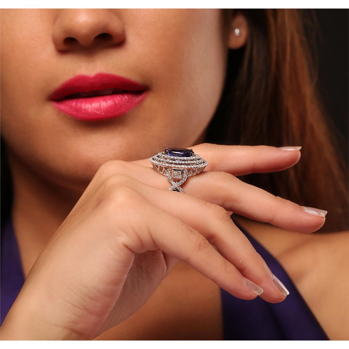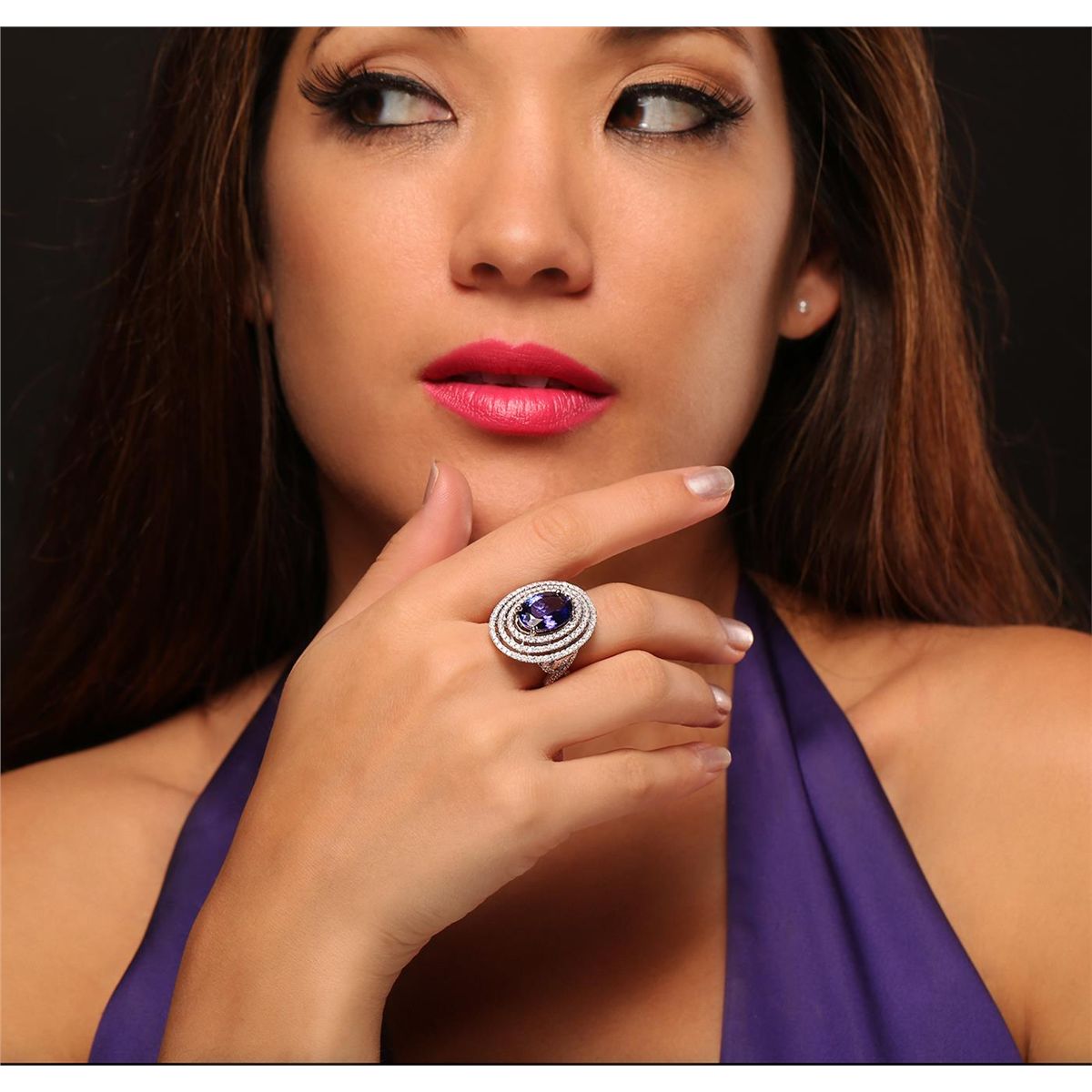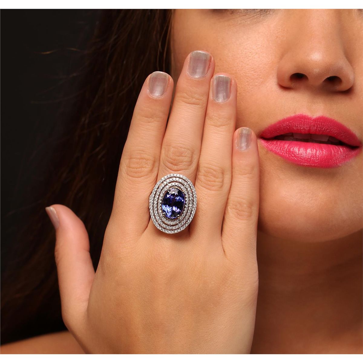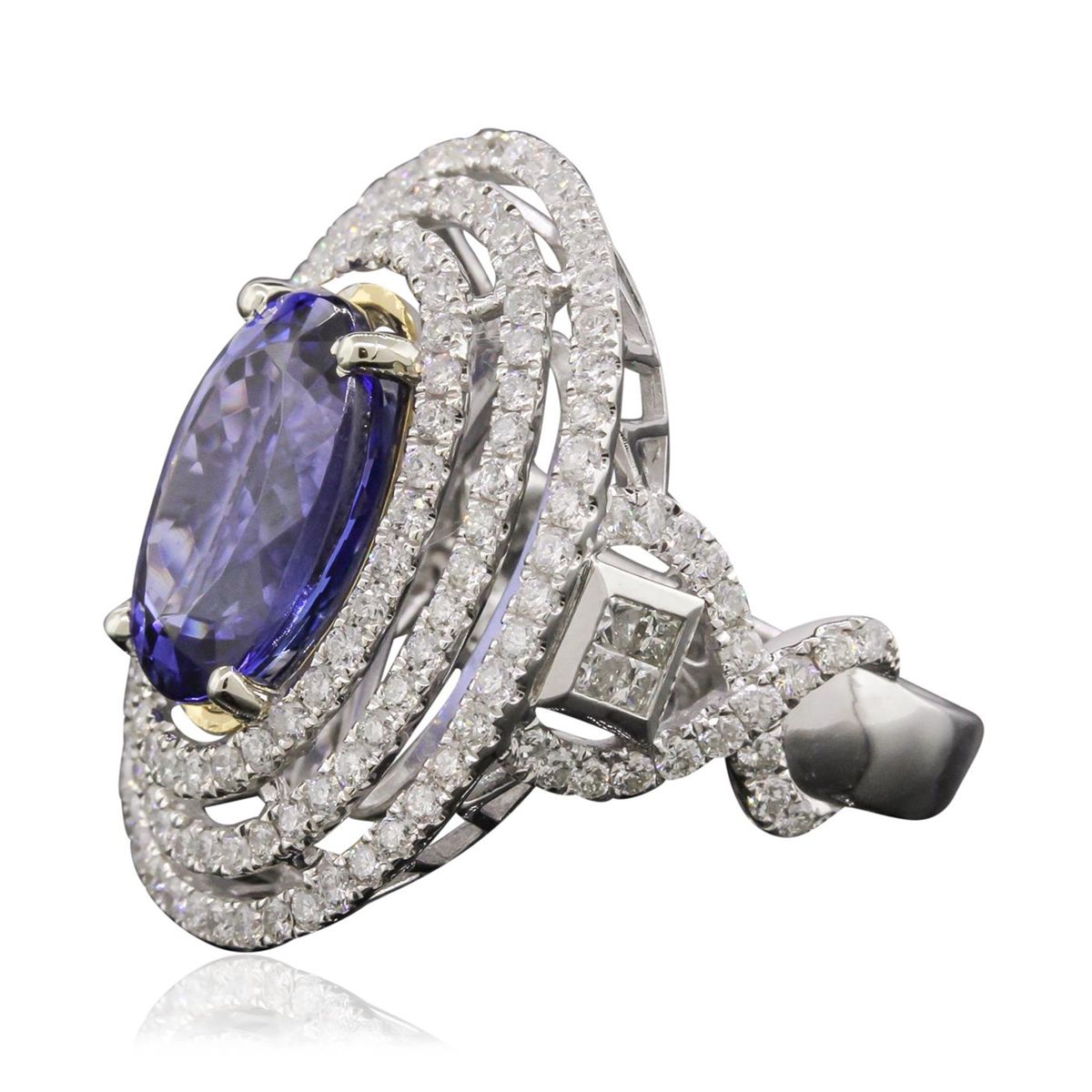 One electronically tested 14KT white and yellow gold Ladies combination cast & assembled fashion ring with a bright polish finish. Condition is new. Identified with markings of "14K". Containing: One Hundred Sixty-Six prong set round brilliant cut diamonds, measuring 1.45 - 1.45 x 0.87mm (depth est.) approximate. Total Weight of 166 Stones = 1.96ct. Clarity: SI-2. Color: H, Cut is Good. Eight invisible set princess cut diamonds, measuring 1.50 x 1.50 x 1.13mm (depth est.) approximate. Total Weight of 8 Stones = 0.20ct. Clarity: SI-2. Color: I - J, Cut is Good. One prong set oval modified brilliant cut natural tanzanite, measuring 14.00 x 10.00 x 6.70mm, approximate weight of 6.46ct., clarity is eye clean, type I, medium, moderately strong, bluish violet color, (GIA bV 5/4), cut is very good. Colored gemstones are presumed to have been subjected to commonly used color/clarity enhancement processes. Total Weight of Colored Stones 6.46ct. Total Weight of Diamonds 2.16ct. Total Weight of Ring 10.20 grams. GGL Appraised at $16,625.00.