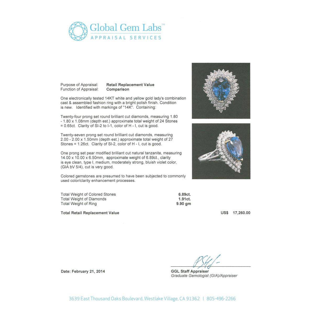 One electronically tested 14KT white and yellow gold Ladies combination cast & assembled fashion ring with a bright polish finish. Condition is new. Identified with markings of "14K". Containing: Twenty-Four prong set round brilliant cut diamonds, measuring 1.80 - 1.80 x 1.08mm (depth est.) approximate. Total Weight of 24 Stones = 0.65ct. Clarity: SI-2 to I-1. Color: H - I, Cut is Good. Twenty-Seven prong set round brilliant cut diamonds, measuring 2.00 - 2.00 x 1.50mm (depth est.) approximate. Total Weight of 27 Stones = 1.26ct. Clarity: SI-2. Color: H - I, Cut is Good. One prong set pear modified brilliant cut natural tanzanite, measuring 14.00 x 10.00 x 6.50mm, approximate weight of 6.89ct., clarity is eye clean, type I, medium, moderately strong, bluish violet color, (GIA bV 5/4), cut is very good. Colored gemstones are presumed to have been subjected to commonly used color/clarity enhancement processes. Total Weight of Colored Stones 6.89ct. Total Weight of Diamonds 1.91ct. Total Weight of Ring 9.90 grams. GGL Appraised at $17,260.00.
