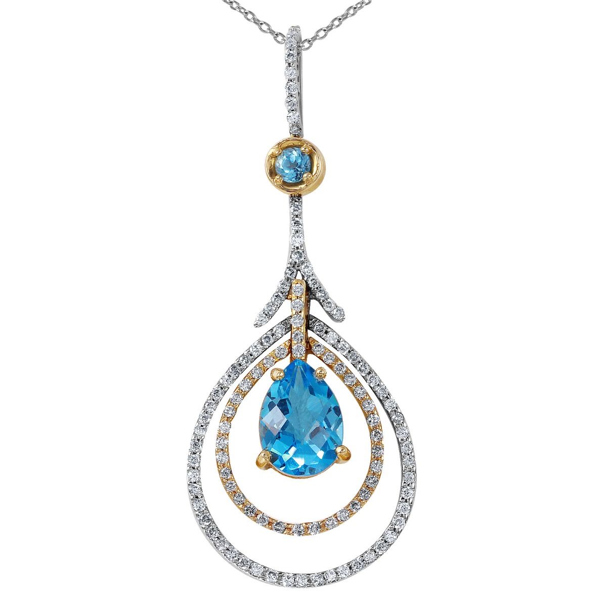 One stamped & tested 14KT white and yellow gold ladies cast topaz and diamond pendant & chain 16.0" long, with a spring ring clasp with a bright polish finish. Identified with markings of "14K". Condition is new. Containing: One prong set pear modified brilliant cut natural blue topaz, measuring 9.00 x 7.00 x 4.55mm, approximate weight of 2.02ct., clarity is eye clean, medium, moderately strong, blue color, cut is excellent. One prong set round modified brilliant cut natural blue topaz, measuring 3.50 - 3.50 x 2.28 mm, approximate weight of 0.20ct., clarity is eye clean, type I, medium, moderately strong, blue color, cut is excellent. One Hundred prong set round brilliant cut diamonds, measuring 0.09 - 0.09 x 0.05mm (depth est.) approximate total weight of 100 Stones = 0.75ct. Clarity: I-1. Color: H - I, Cut is Good. Approximate Total Weight of Colored Stones 2.22ct. Approximate Total Weight of Diamonds 0.75ct. Total Weight of Pendant & Chain 5.00gm. The descriptions listed should not be construed as an appraisal. The detail is provided as a guideline for color, clarity, weights and measurements to the best of our ability. We welcome inspections. WE SHIP WORLDWIDE!