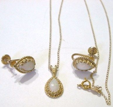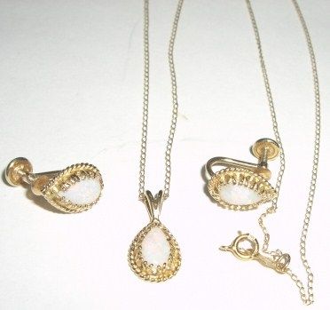 14KT YELLOW GOLD OPAL EARRINGS & PENDANT ON NECKLACE SET. STAMPED *14KT*!! TOTAL WEIGHT IS 4.17 GRAMS!! ***Coin, Currency & All Items Listed in this auction - Grades, Conditions and Values are not Safe Deposit Coins LLC Responsibilty. Grades, Condition and Values are determined by Consigner(s) & Buyers ONLY***