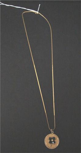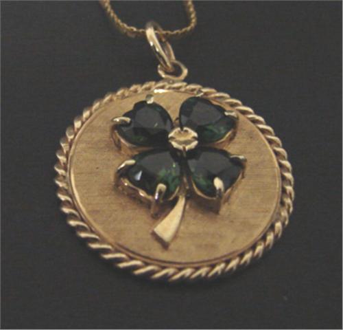 14KT YELLOW GOLD PENDANT. Has 4 peridot-like stones, approx. 3 ct. t.w. & 24" chain. 13.1 grams wt. CAGA appraisal.