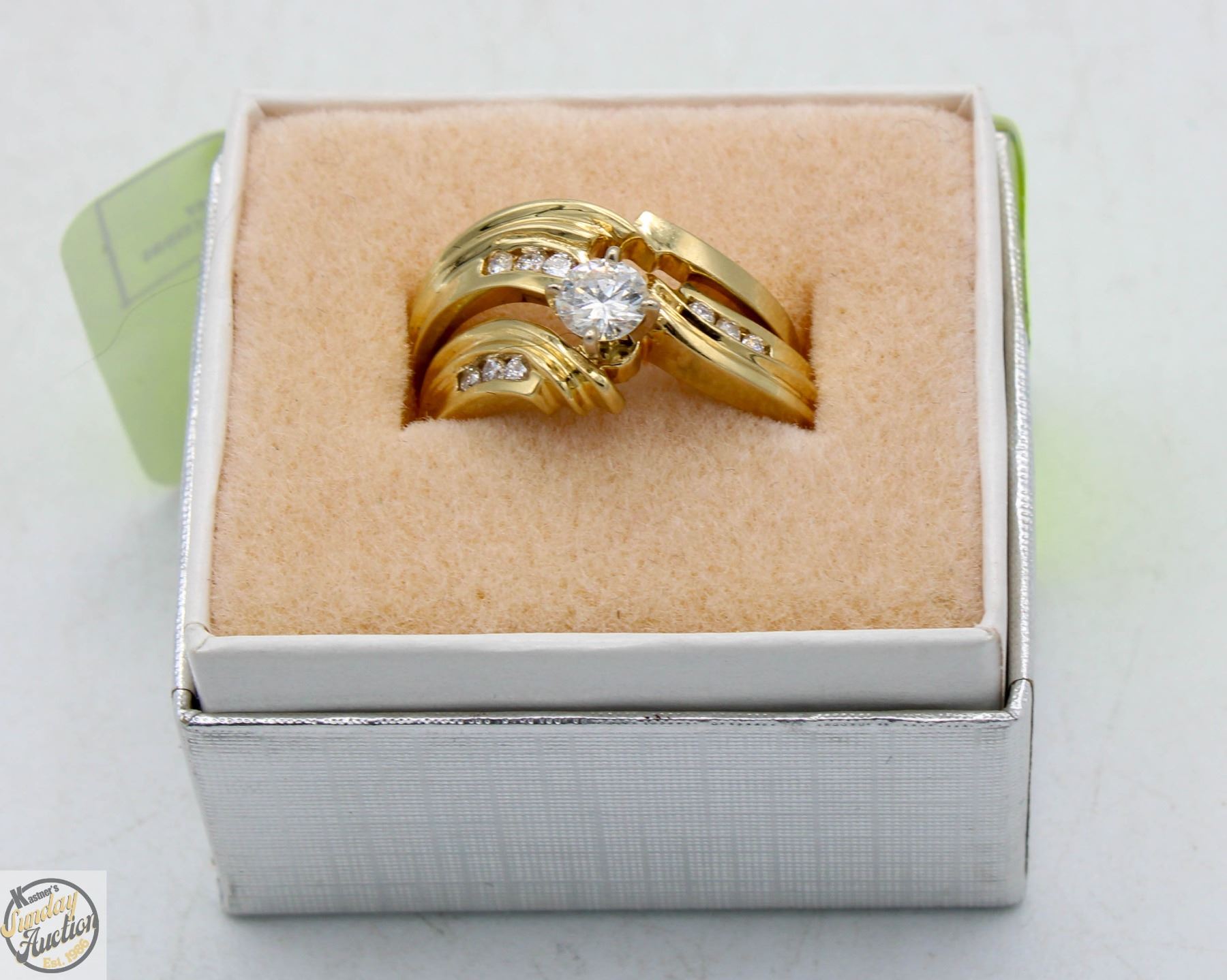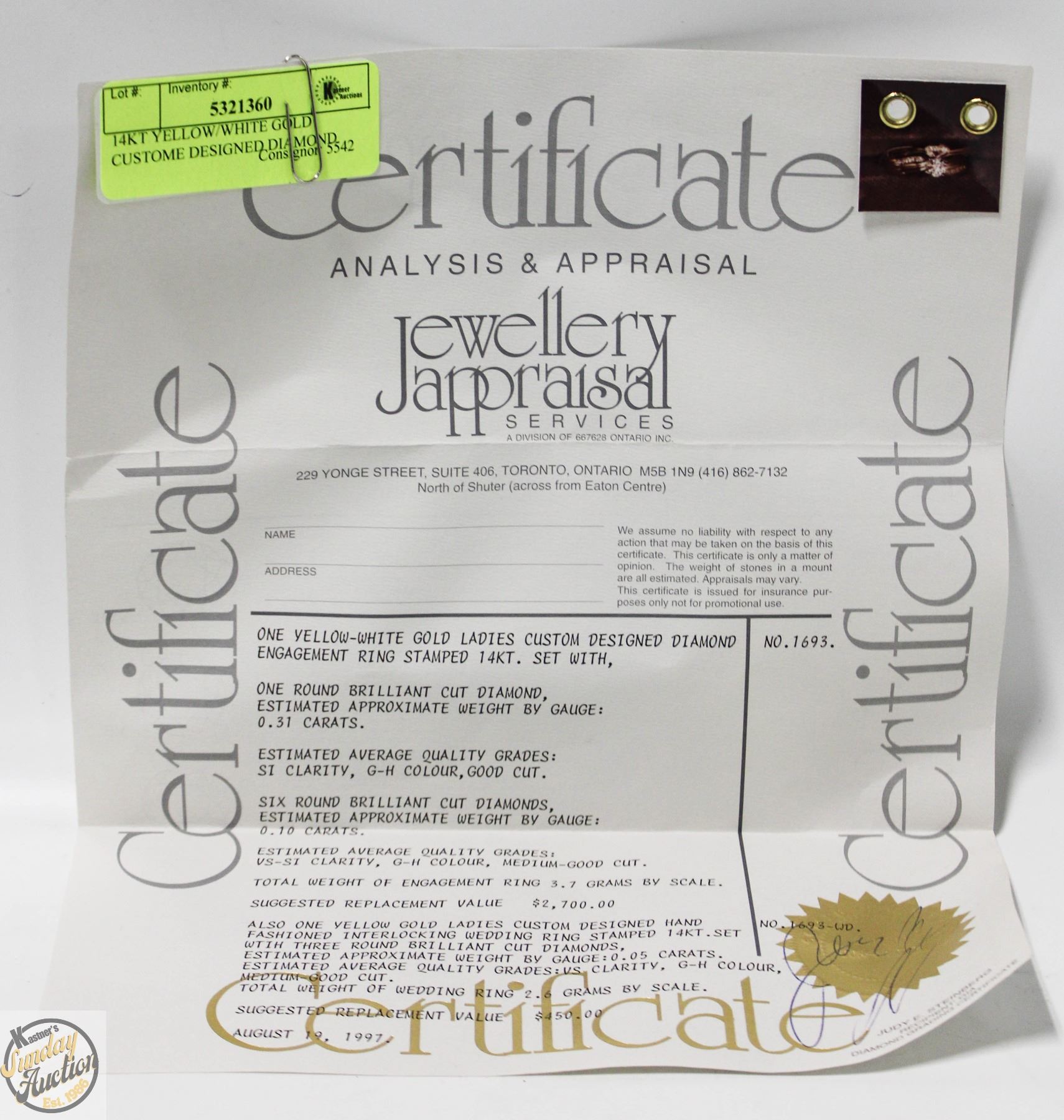 ENGAGEMENT RING SET WITH ROUND BRILLIANT CUT DIAMOND (0.31CT), ESTIMATED AVERAGE SI CLARITY, G-H COLOR, GOOD CUT. SIX ROUND BRILLIANT CUT DIAMONDS ESTIMATED 0.10CT, ESTIMATED AVERAGE VS-SI CLARITY, G-H COLOR, MEDIUM-GOOD CUT, 3.7G. COMES WITH YELLOW GOLD CUSTOM DESIGNED HAND FASHIONED INTERLOCKING WEDDING RING STAMPED 14K, 0.05CT, VS CLARITY, G-H COLOR, MEDIUM-GOOD CUT. TOTAL WEIGHT 2.6G. COMES WITH 1997 APPRAISAL WITH REPLACEMENT VALUE OF $450.00, SIZE 6 **ALL ITEMS MUST BE REMOVED BY 5PM SATURDAY, MAY 17TH 2025. ALL REMAINING ITEMS WILL BE SUBJECT TO A $6.00 PER DAY STORAGE CHARGE. ANY ITEMS REMAINING AFTER MONDAY, JUNE 2ND 2025 WILL BE CONSIDERED FORFEITED. NO REFUNDS WILL BE ISSUED FOR FORFEITED ITEMS. TO SCHEDULE A PICK UP APPOINTMENT CLICK HERE