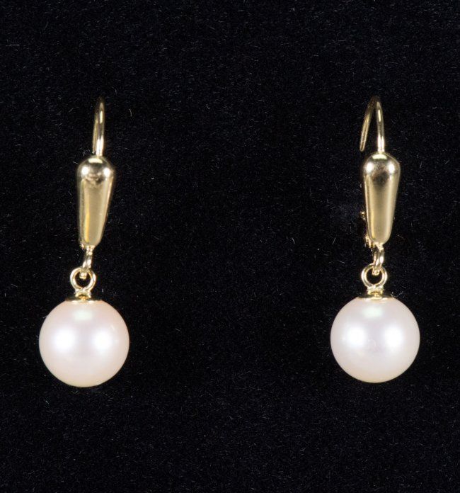 14KT Yellow Drop Earrings with Fresh Water Pearls; D: 7.85 mm each pearl, 2.12 grams total