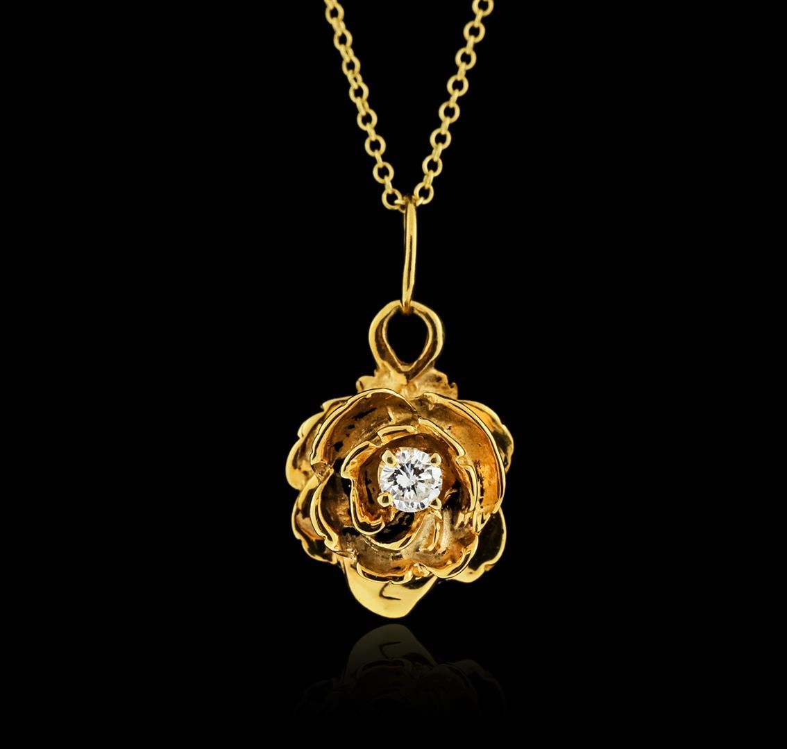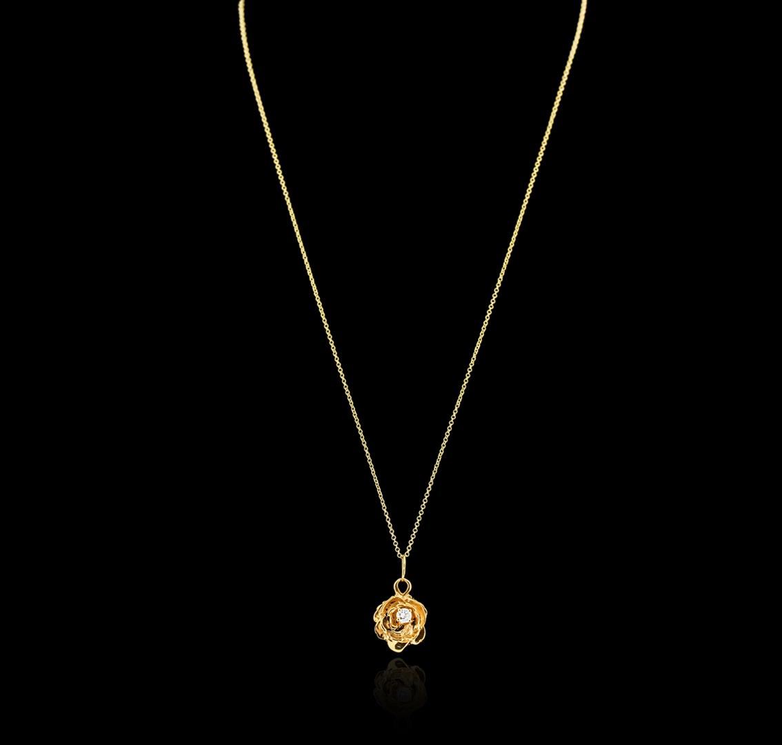 One flower pendant with chain featuring: 14KT yellow gold weighing 3.00 grams containing one prong set round diamond with a total weight of 0.08ct.