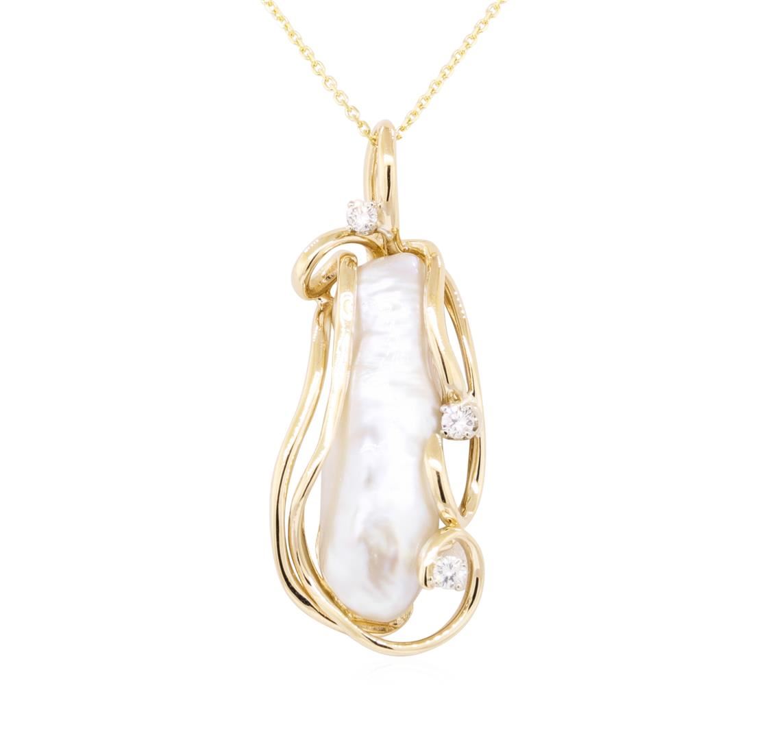 One pendant with a sixteen inch long 0.7mm diamond cut cable link chain featuring: 14KT yellow gold weighing 6.6 grams containing one freeform freshwater pearl and diamonds weighing 0.10ctw.