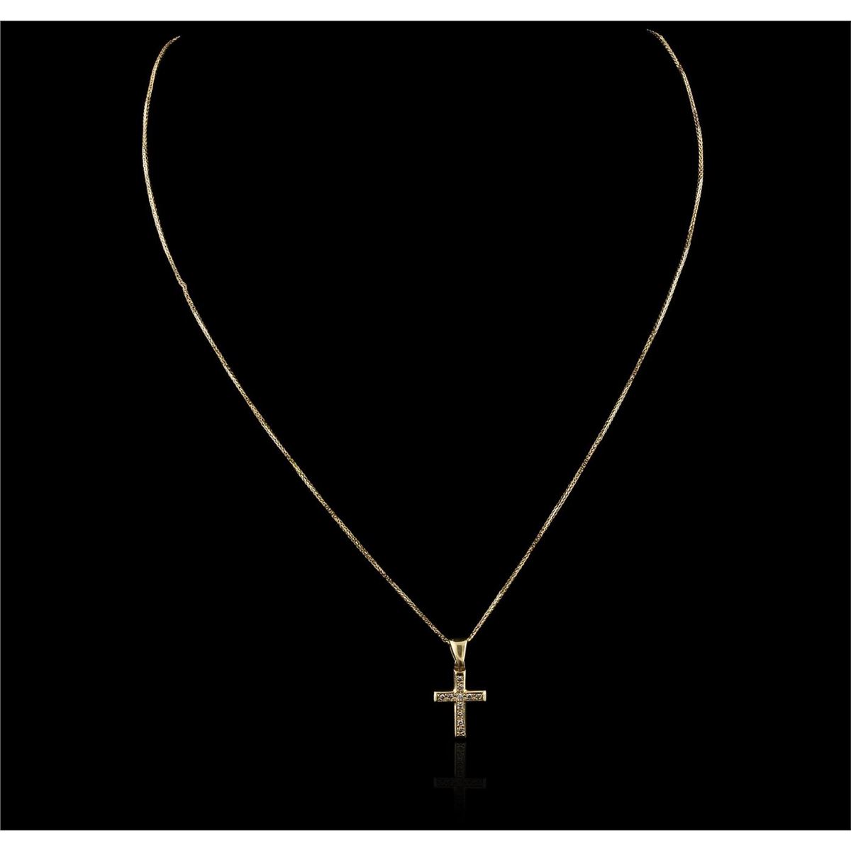 One cross pendant with chain featuring: 14KT yellow gold weighing 3.10 grams containing round diamonds with a total weight of 0.10ct.