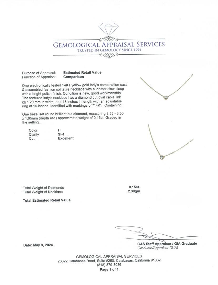 One electronically tested 14KT yellow gold lady's combination cast & assembled fashion solitaire necklace with a lobster claw clasp with a bright polish finish. Condition is new, good workmanship. The featured lady's necklace has a diamond cut oval cable GAS Appraised.