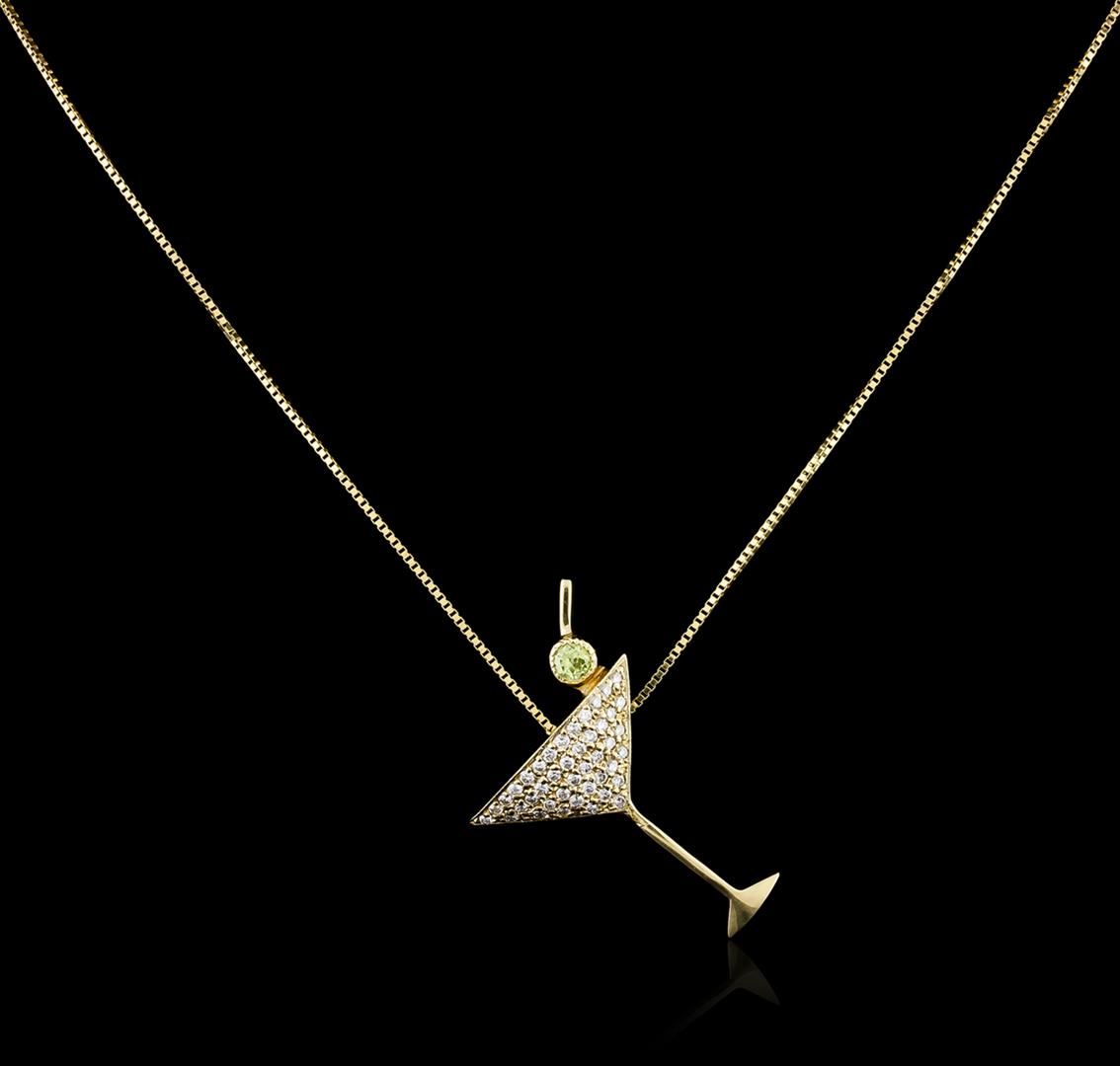 One pendant with chain featuring: 14KT yellow gold weighing 4.40 grams containing one peridot center stone with a total weight of 0.15 and diamonds with a total weight of 0.35ct.
