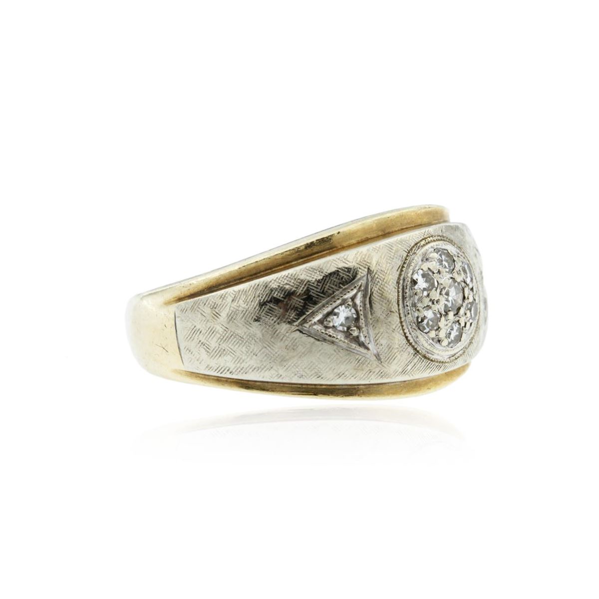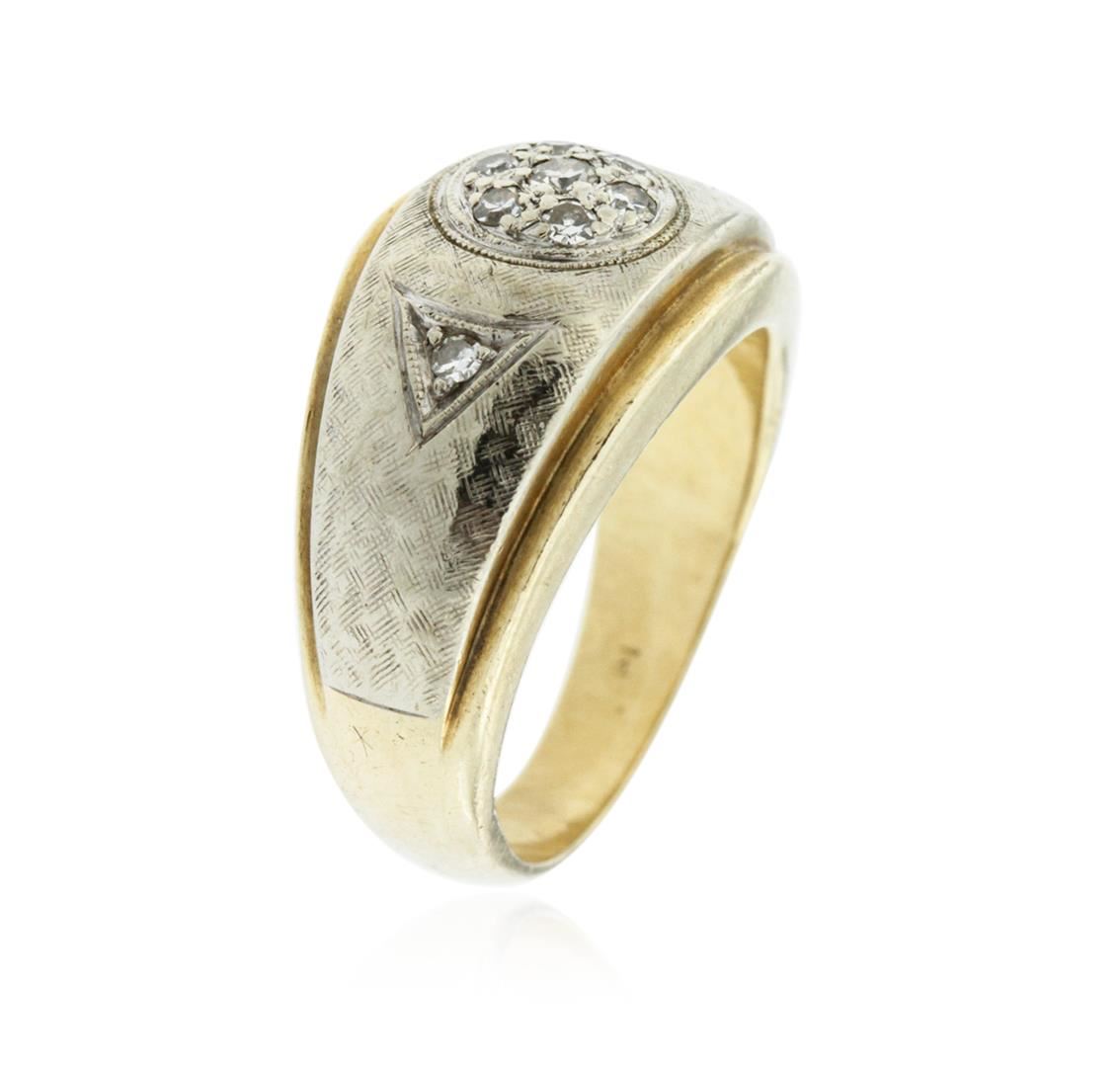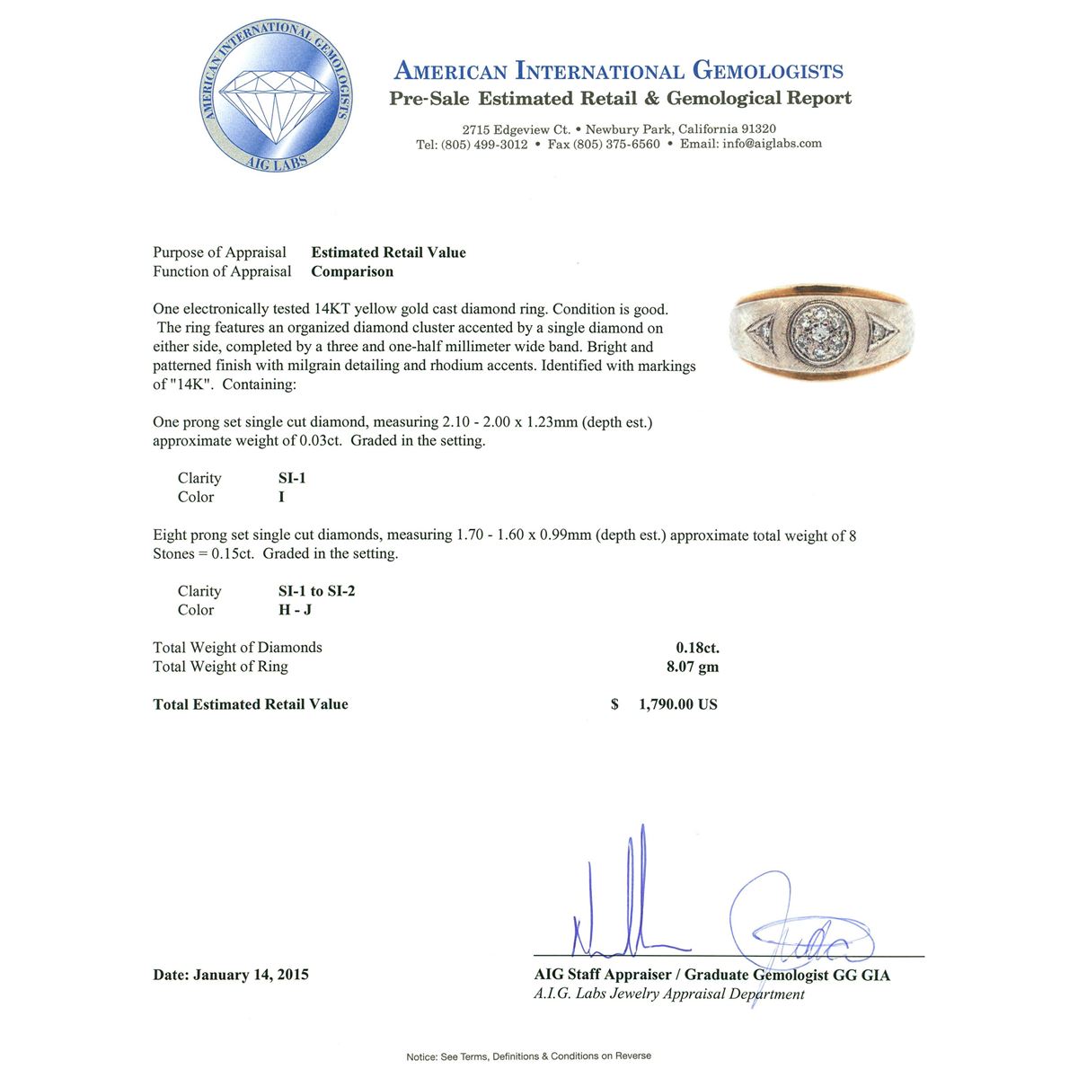 One electronically tested 14KT yellow gold cast diamond ring. The ring features an organized diamond cluster accented by a single diamond on either side, completed by a three and one-half millimeter wide band. Bright and patterned finish with milgrain detailing and rhodium accents. Identified with markings of "14K". Condition is good. Containing: One prong set single cut diamond, measuring 2.10 - 2.00 x 1.23mm (depth est.) approximate weight of 0.03ct. Graded in the setting. Clarity: SI-1. Color: I Eight prong set single cut diamonds, measuring 1.70 - 1.60 x 0.99mm (depth est.) approximate total weight of 8 Stones = 0.15ct. Graded in the setting. Clarity: SI-1 to SI-2. Color: H - J. Total Weight of Diamonds 0.18ct. Total Weight of Ring 8.07 grams. AIG Appraised.