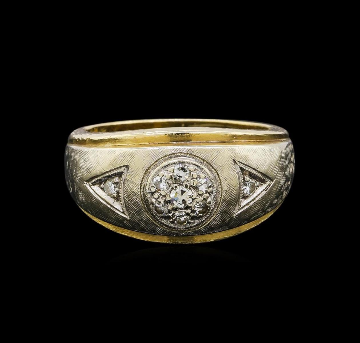 One electronically tested 14KT yellow gold cast diamond ring. The ring features an organized diamond cluster accented by a single diamond on either side, completed by a three and one-half millimeter wide band. Bright and patterned finish with milgrain detailing and rhodium accents. Identified with markings of "14K". Condition is good. Containing: One prong set single cut diamond, measuring 2.10 - 2.00 x 1.23mm (depth est.) approximate weight of 0.03ct. Graded in the setting. Clarity: SI-1. Color: I Eight prong set single cut diamonds, measuring 1.70 - 1.60 x 0.99mm (depth est.) approximate total weight of 8 Stones = 0.15ct. Graded in the setting. Clarity: SI-1 to SI-2. Color: H - J. Total Weight of Diamonds 0.18ct. Total Weight of Ring 8.07 grams. AIG Appraised.