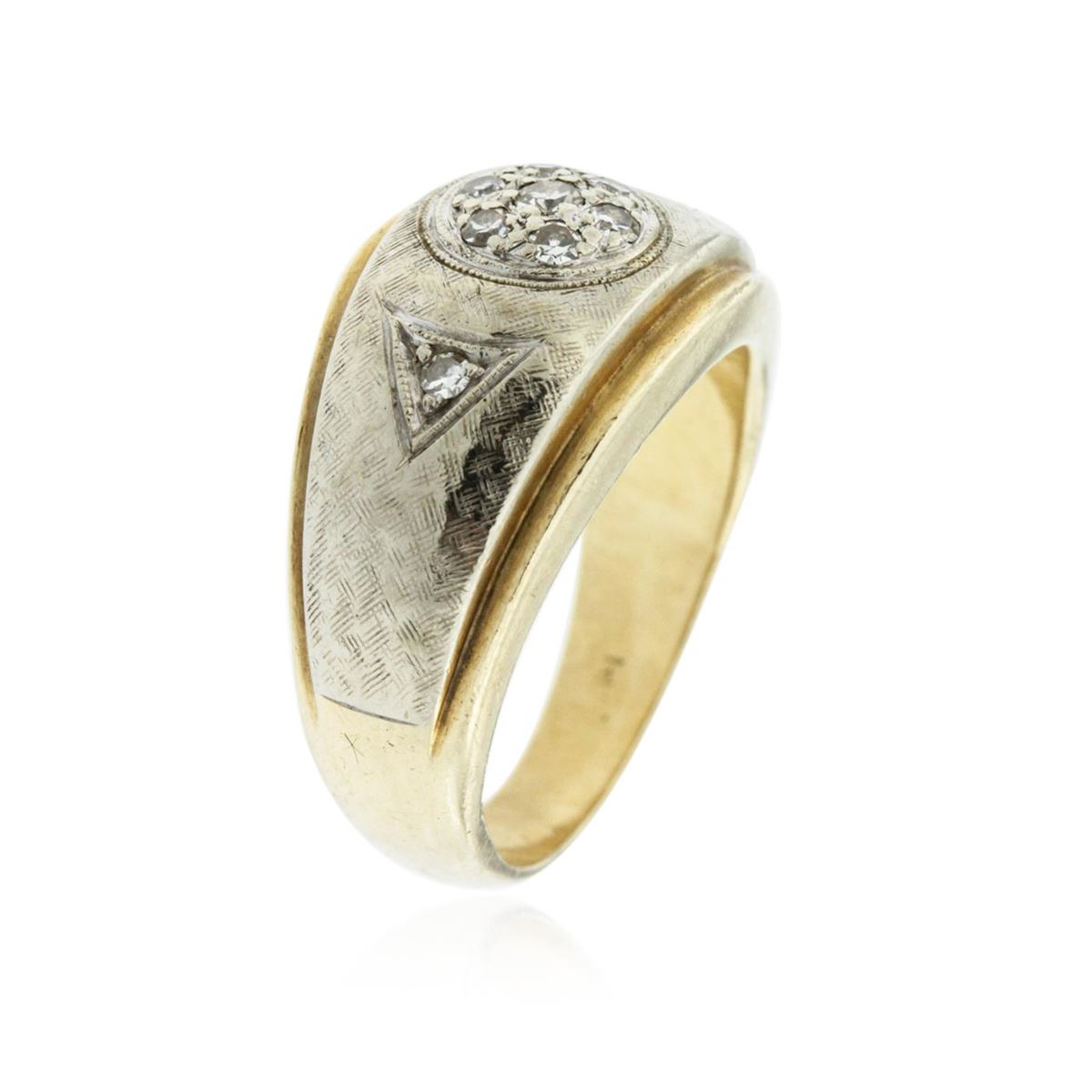 One electronically tested 14KT yellow gold cast diamond ring. The ring features an organized diamond cluster accented by a single diamond on either side, completed by a three and one-half millimeter wide band. Bright and patterned finish with milgrain detailing and rhodium accents. Identified with markings of "14K". Condition is good. Containing: One prong set single cut diamond, measuring 2.10 - 2.00 x 1.23mm (depth est.) approximate weight of 0.03ct. Graded in the setting. Clarity: SI-1. Color: I Eight prong set single cut diamonds, measuring 1.70 - 1.60 x 0.99mm (depth est.) approximate total weight of 8 Stones = 0.15ct. Graded in the setting. Clarity: SI-1 to SI-2. Color: H - J. Total Weight of Diamonds 0.18ct. Total Weight of Ring 8.07 grams. AIG Appraised.