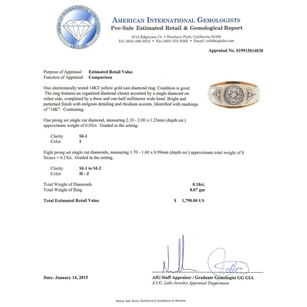 One electronically tested 14KT yellow gold cast diamond ring. The ring features an organized diamond cluster accented by a single diamond on either side, completed by a three and one-half millimeter wide band. Bright and patterned finish with milgrain detailing and rhodium accents. Identified with markings of "14K". Condition is good. Containing: One prong set single cut diamond, measuring 2.10 - 2.00 x 1.23mm (depth est.) approximate weight of 0.03ct. Graded in the setting. Clarity: SI-1. Color: I Eight prong set single cut diamonds, measuring 1.70 - 1.60 x 0.99mm (depth est.) approximate total weight of 8 Stones = 0.15ct. Graded in the setting. Clarity: SI-1 to SI-2. Color: H - J. Total Weight of Diamonds 0.18ct. Total Weight of Ring 8.07 grams. AIG Appraised.