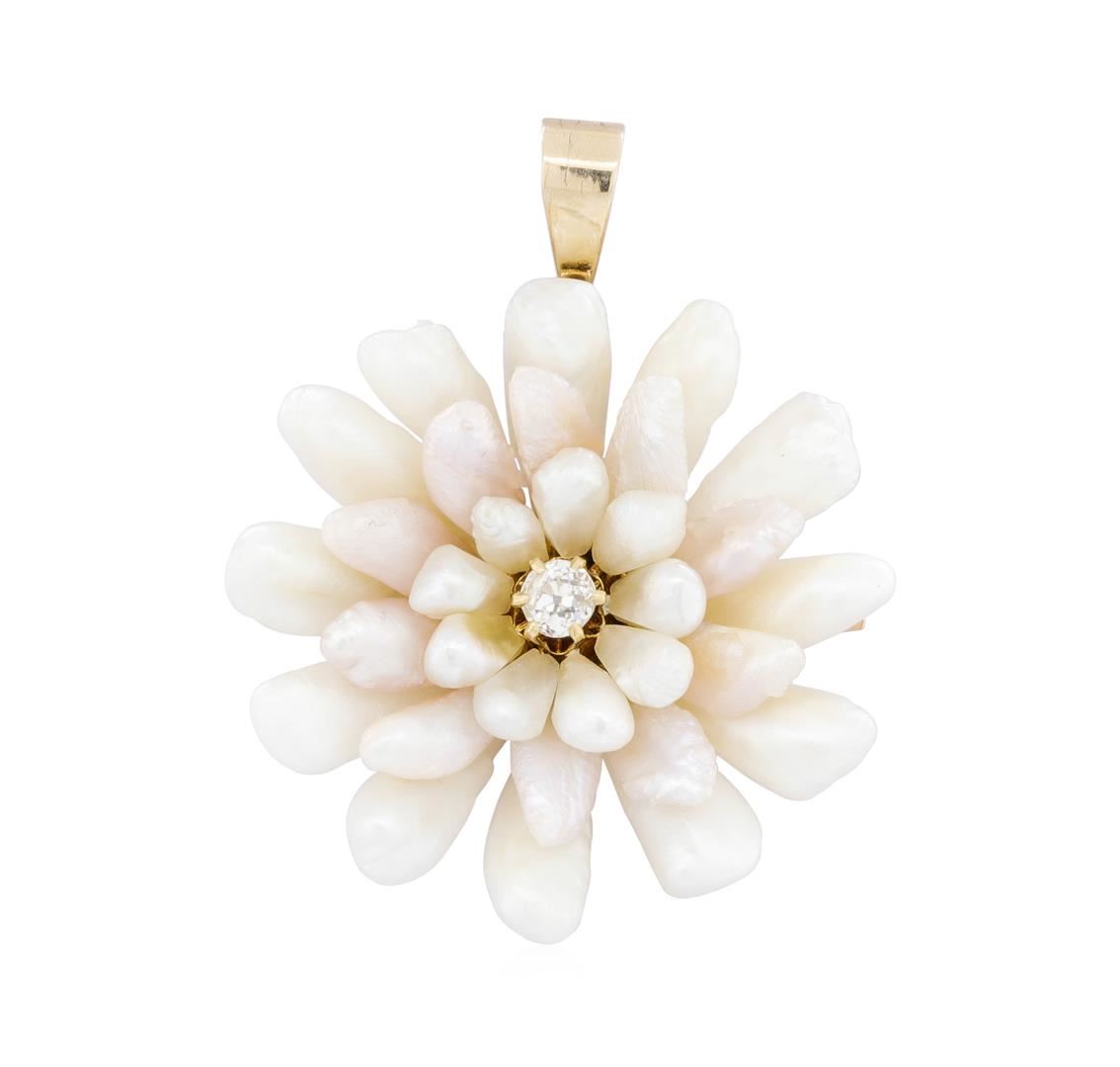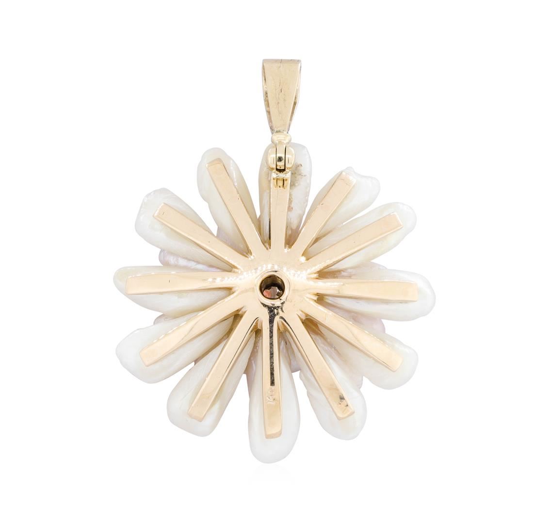 One pendant featuring: 14KT yellow gold weighing 10.1 grams containing freshwater pearls and one diamond weighing 0.20ct and