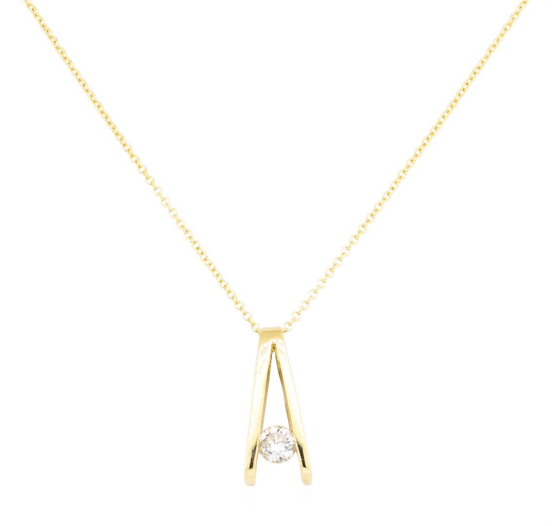 One pendant with chain featuring: 14KT yellow gold weighing 3.4 grams containing one diamond weighing 0.22ct. The cable link chain measures approximately sixteen inches in length.