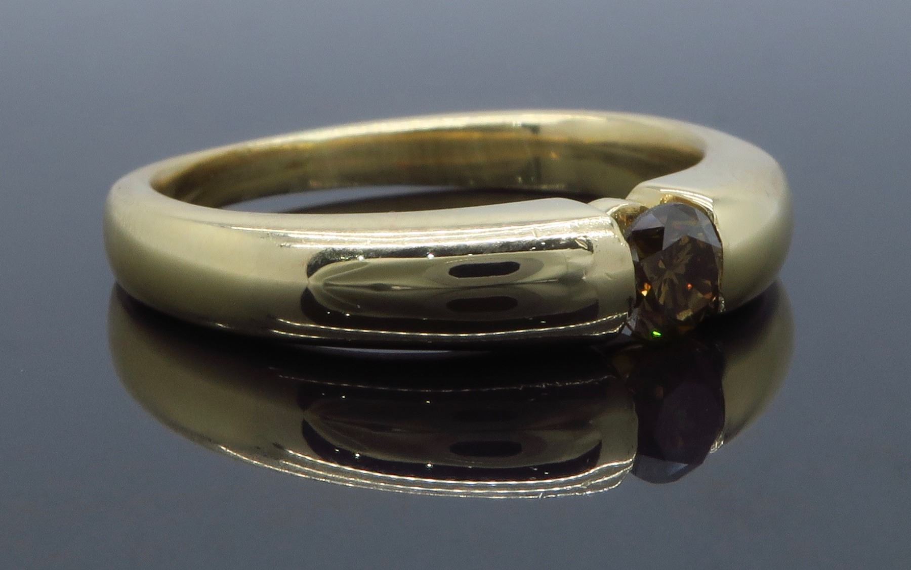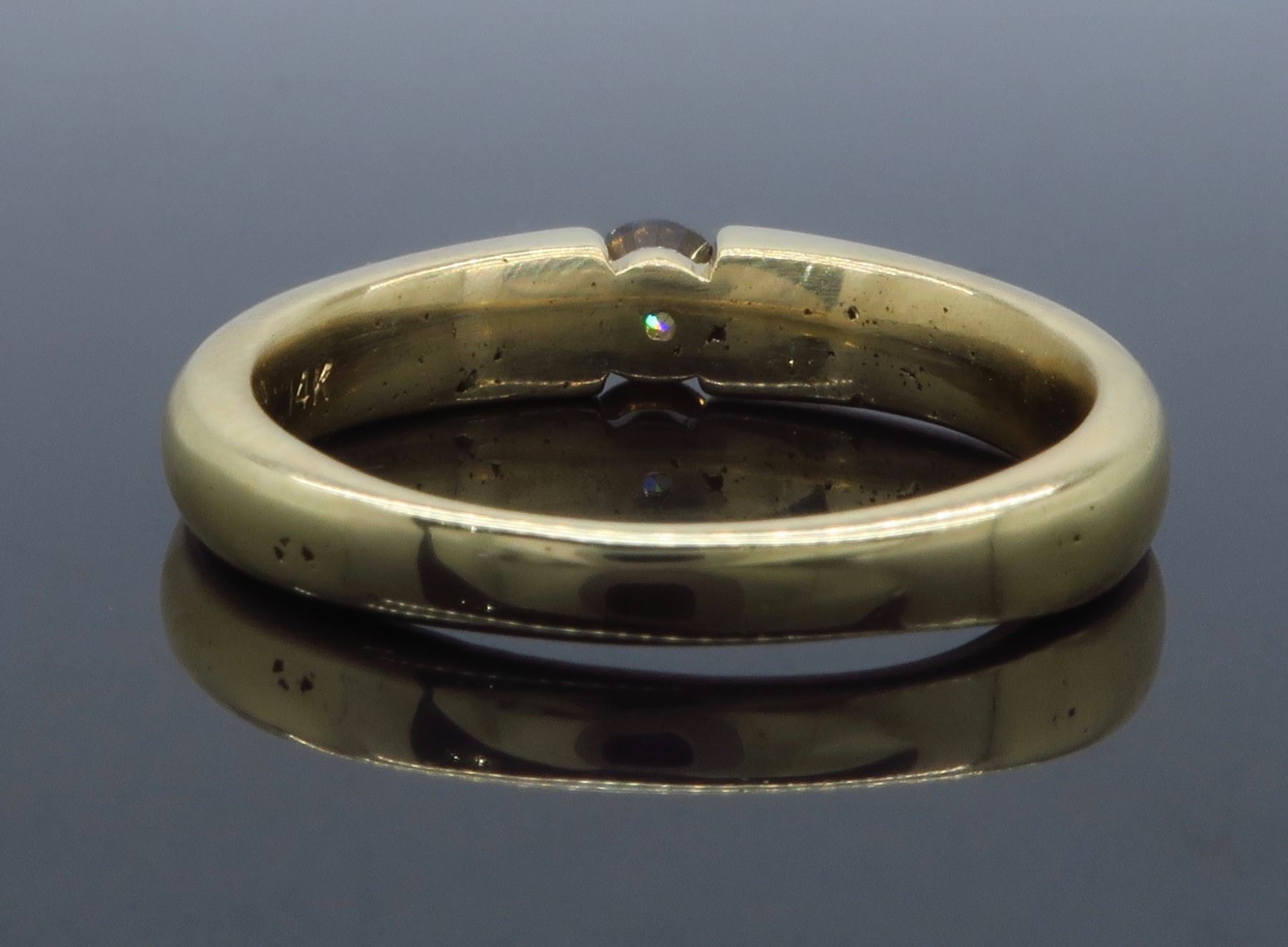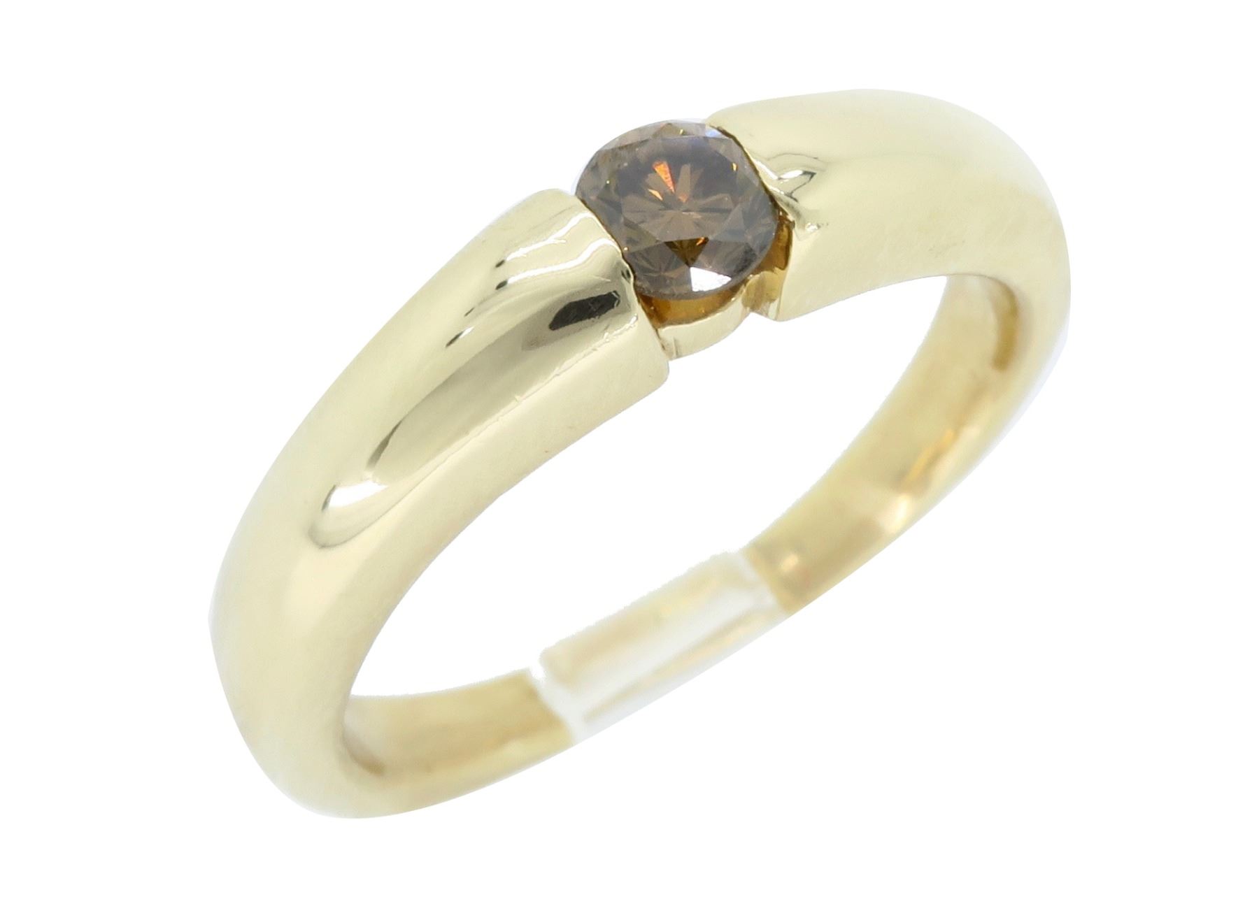 One 14KT Yellow Gold 0.26ct Diamond Ring. (1) round Diamond with a total weight of 0.26cts with a color of cognac and clarity of SI-1. Total weight of this ring is 6.2 grams. Ring size is 7.75.