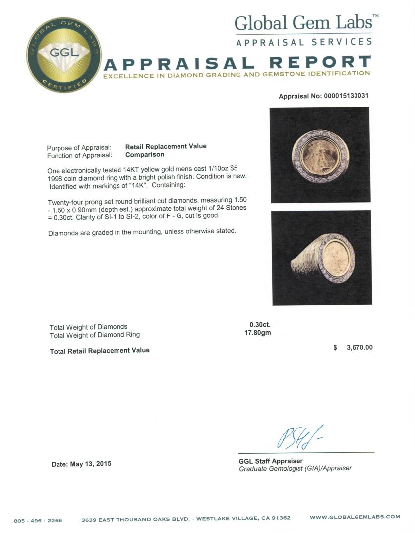 One electronically tested 14KT yellow gold mens cast 1/10oz $5 1998 coin diamond ring with a bright polish finish. Identified with markings of "14K". Condition is new. Containing: Twenty-Four prong set round brilliant cut diamonds, measuring 1.50 - 1.50 x 0.90mm (depth est.) approximate total weight of 24 Stones = 0.30ct. Clarity of SI-1 to SI-2, Color of F - G, Cut is Good. Diamonds are graded in the mounting, unless otherwise stated. Total Weight of Diamonds 0.30ct. Total Weight of Diamond Ring 17.80 grams. GGL Appraised at $3,670.00.