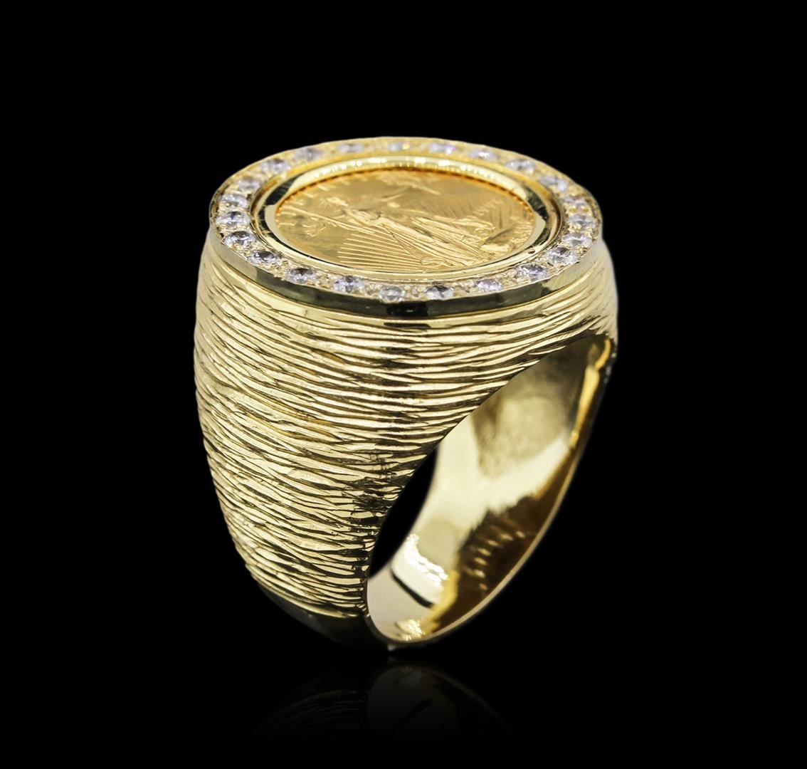 One electronically tested 14KT yellow gold mens cast 1/10oz $5 1998 coin diamond ring with a bright polish finish. Identified with markings of "14K". Condition is new. Containing: Twenty-Four prong set round brilliant cut diamonds, measuring 1.50 - 1.50 x 0.90mm (depth est.) approximate total weight of 24 Stones = 0.30ct. Clarity of SI-1 to SI-2, Color of F - G, Cut is Good. Diamonds are graded in the mounting, unless otherwise stated. Total Weight of Diamonds 0.30ct. Total Weight of Diamond Ring 17.80 grams. GGL Appraised at $3,670.00.