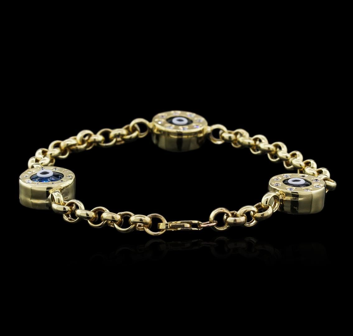 One evil eye bracelet featuring: 14KT yellow gold weighing 8.47 grams containing diamonds with a total weight of 0.30ct.
