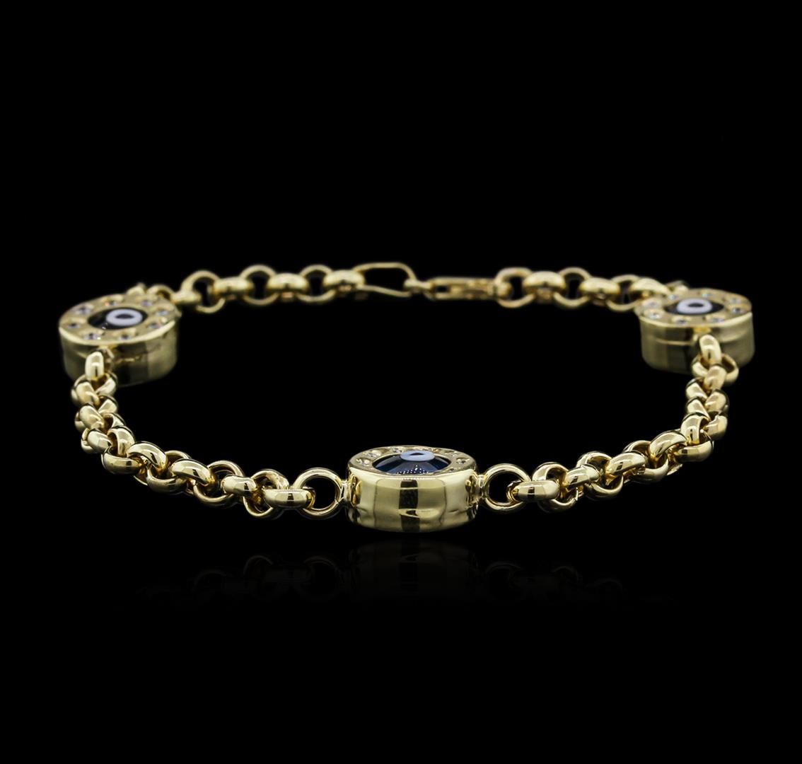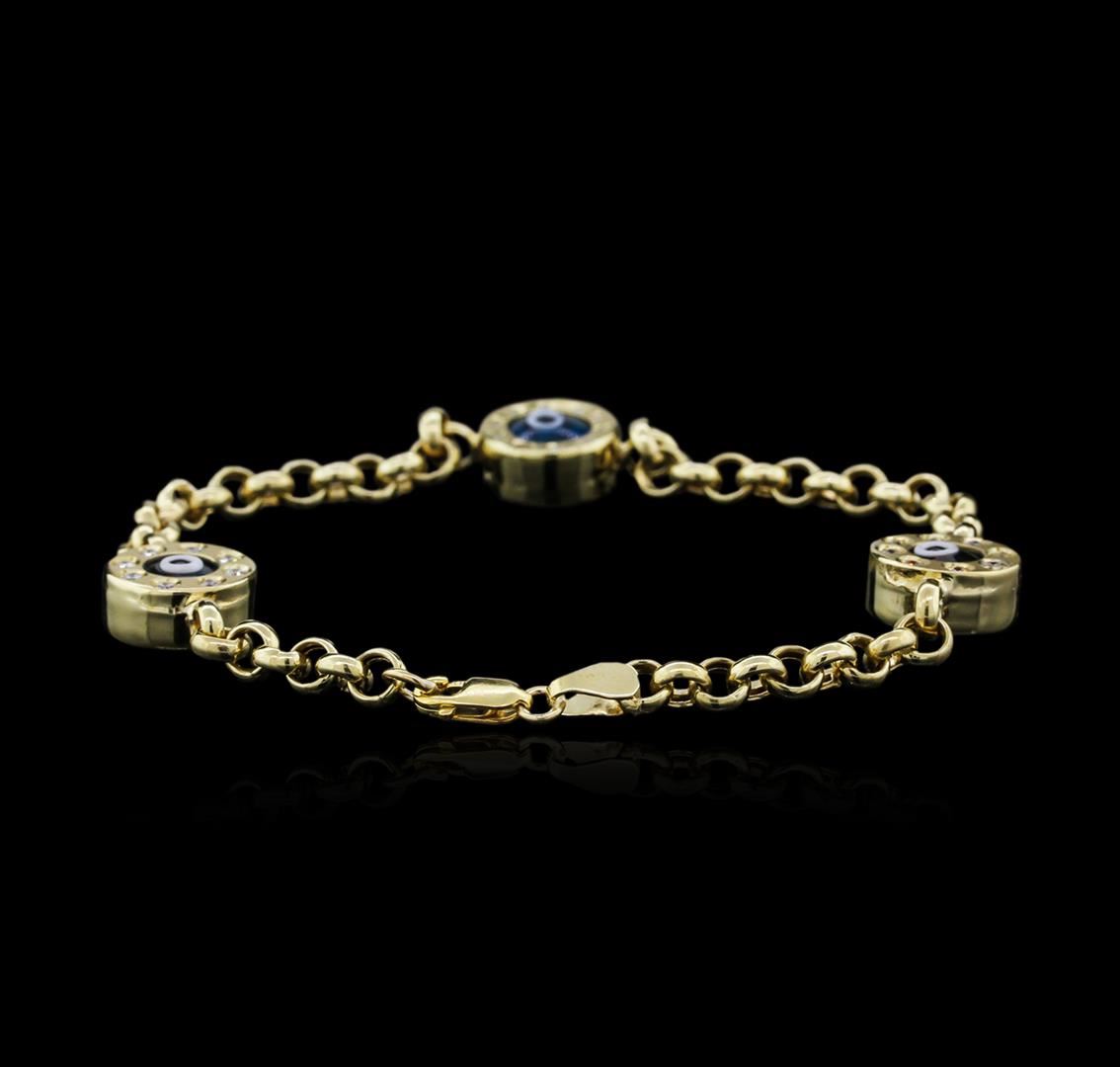 One evil eye bracelet featuring: 14KT yellow gold weighing 9.14 grams containing diamonds with a total weight of 0.30ct.