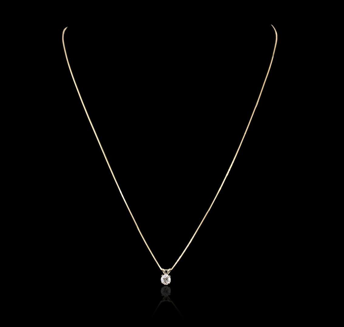 One 14KT yellow gold pendant with chain featuring one diamond with a total weight of 0.33ct, VS clarity, and H-I color. Diamond has a small culet. Total weight of pendant with chain is 0.93 grams.