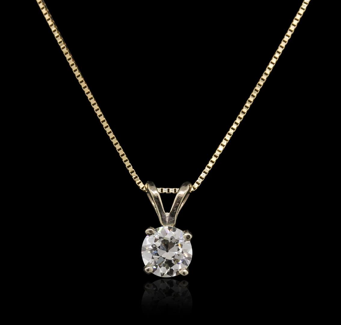 One 14KT yellow gold pendant with chain featuring one diamond with a total weight of 0.33ct, VS clarity, and H-I color. Diamond has a small culet. Total weight of pendant with chain is 0.93 grams.