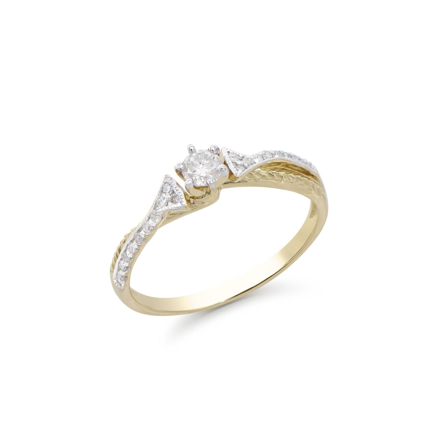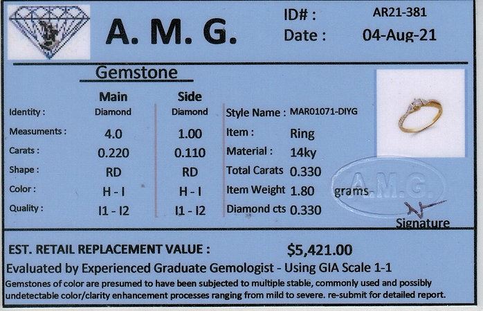 (1) round Diamond with a total weight of 0.22cts with a color of H-I and clarity of I1-I2. (22) round Diamonds with a total weight of 0.11cts with a color of H-I and clarity of I1-I2. Total weight of this ring is 1.8 grams. Ring size is 7.5.