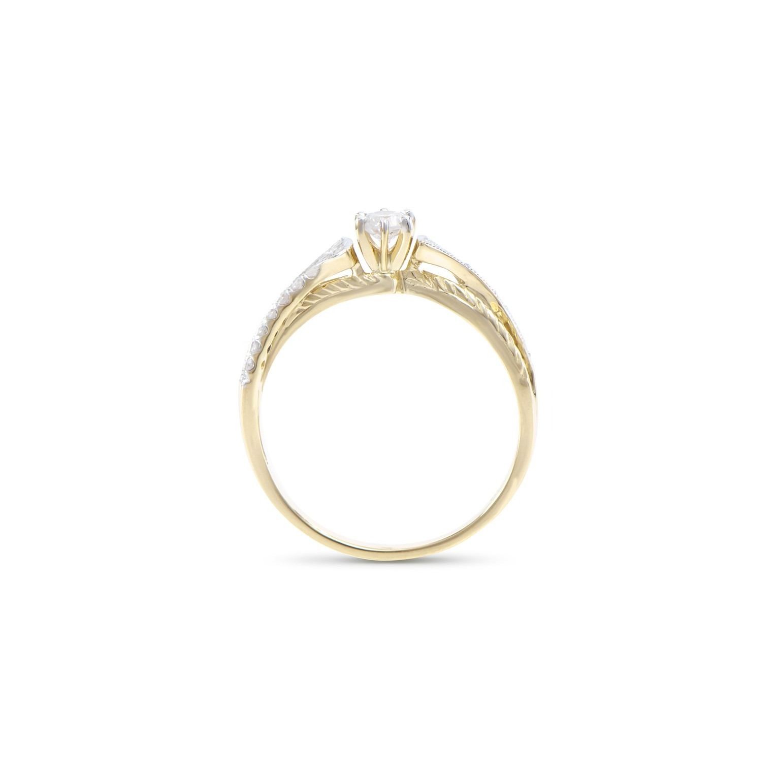 (1) round Diamond with a total weight of 0.22cts with a color of H-I and clarity of I1-I2. (22) round Diamonds with a total weight of 0.11cts with a color of H-I and clarity of I1-I2. Total weight of this ring is 1.8 grams. Ring size is 7.5.