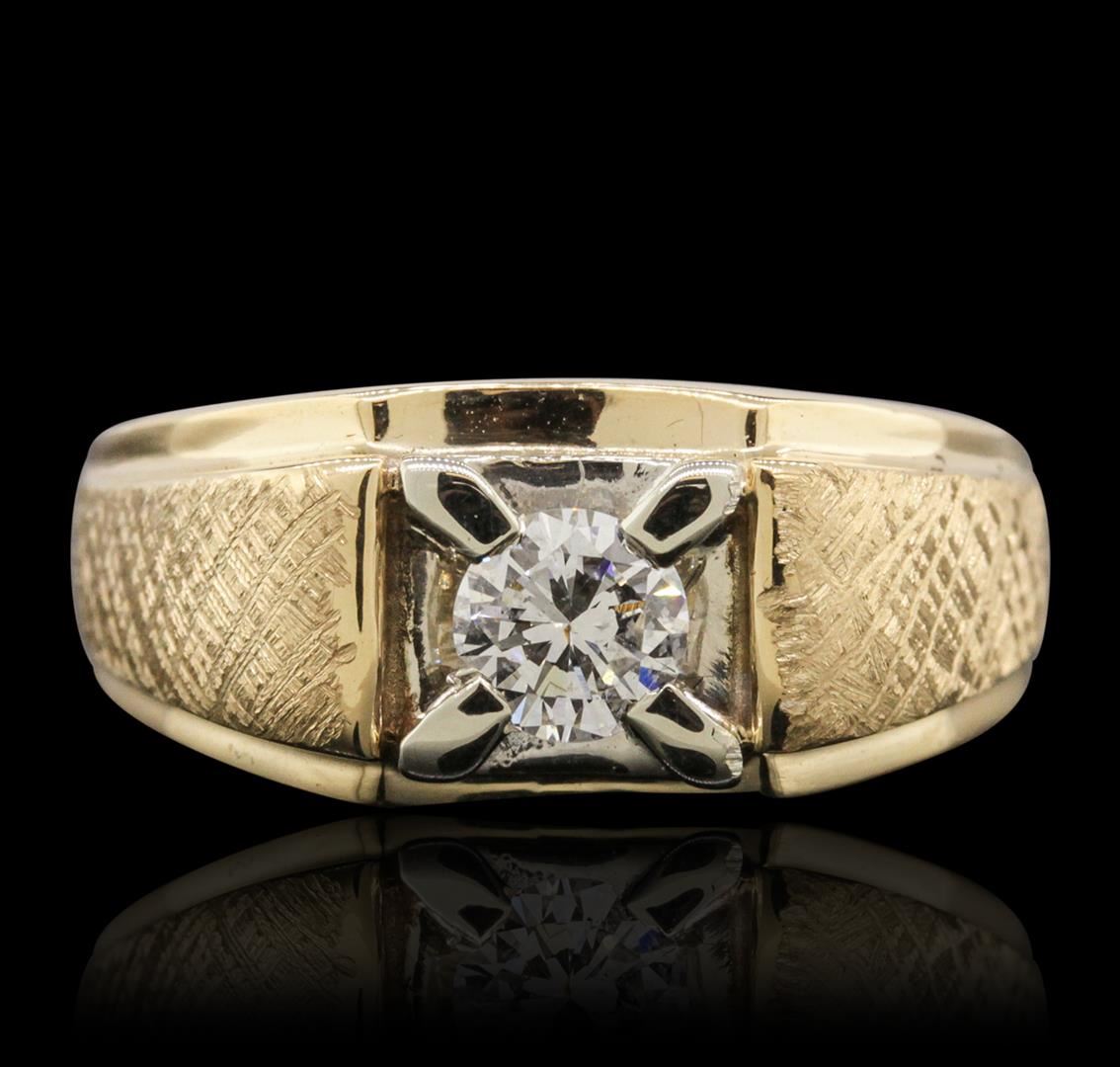 One electronically tested 14KT yellow gold ladies cast solitaire ring with a hammered finish. Condition is very good. Identified with markings of "14K". Containing: One prong set round brilliant cut diamond, measuring 4.30 - 4.30 x 3.00mm (depth est.) approximate weight of 0.34ct. Clarity: SI-2. Color: I, Cut is Good. All diamonds are graded in the mounting, unless otherwise stated. Total Weight of Diamonds 0.34ct. Total Weight of Ring 8.60 grams. GGL Appraised at $5,175.00.