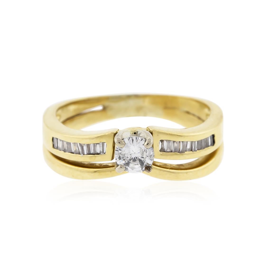 One wedding ring set featuring: 14KT yellow gold weighing 5.10 grams containing one center diamonds with a total weight of 0.20ct and baguette cut diamonds with a total weight of 0.14ct.