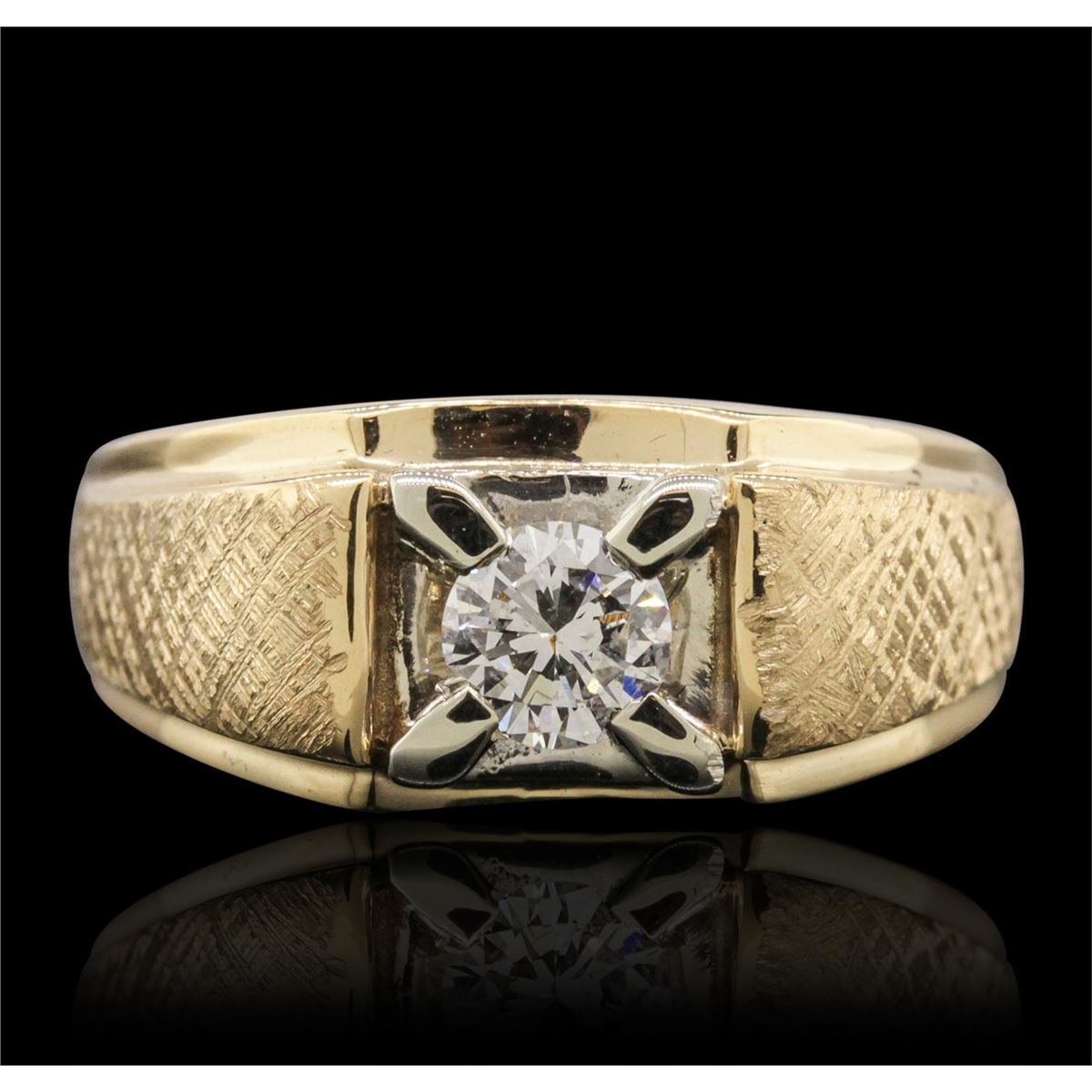 One electronically tested 14KT yellow gold ladies cast solitaire ring with a hammered finish. Condition is very good. Identified with markings of "14K". Containing: One prong set round brilliant cut diamond, measuring 4.30 - 4.30 x 3.00mm (depth est.) approximate weight of 0.34ct. Clarity: SI-2. Color: I, Cut is Good. All diamonds are graded in the mounting, unless otherwise stated. Total Weight of Diamonds 0.34ct. Total Weight of Ring 8.60 grams. GGL Appraised at $5,175.00.