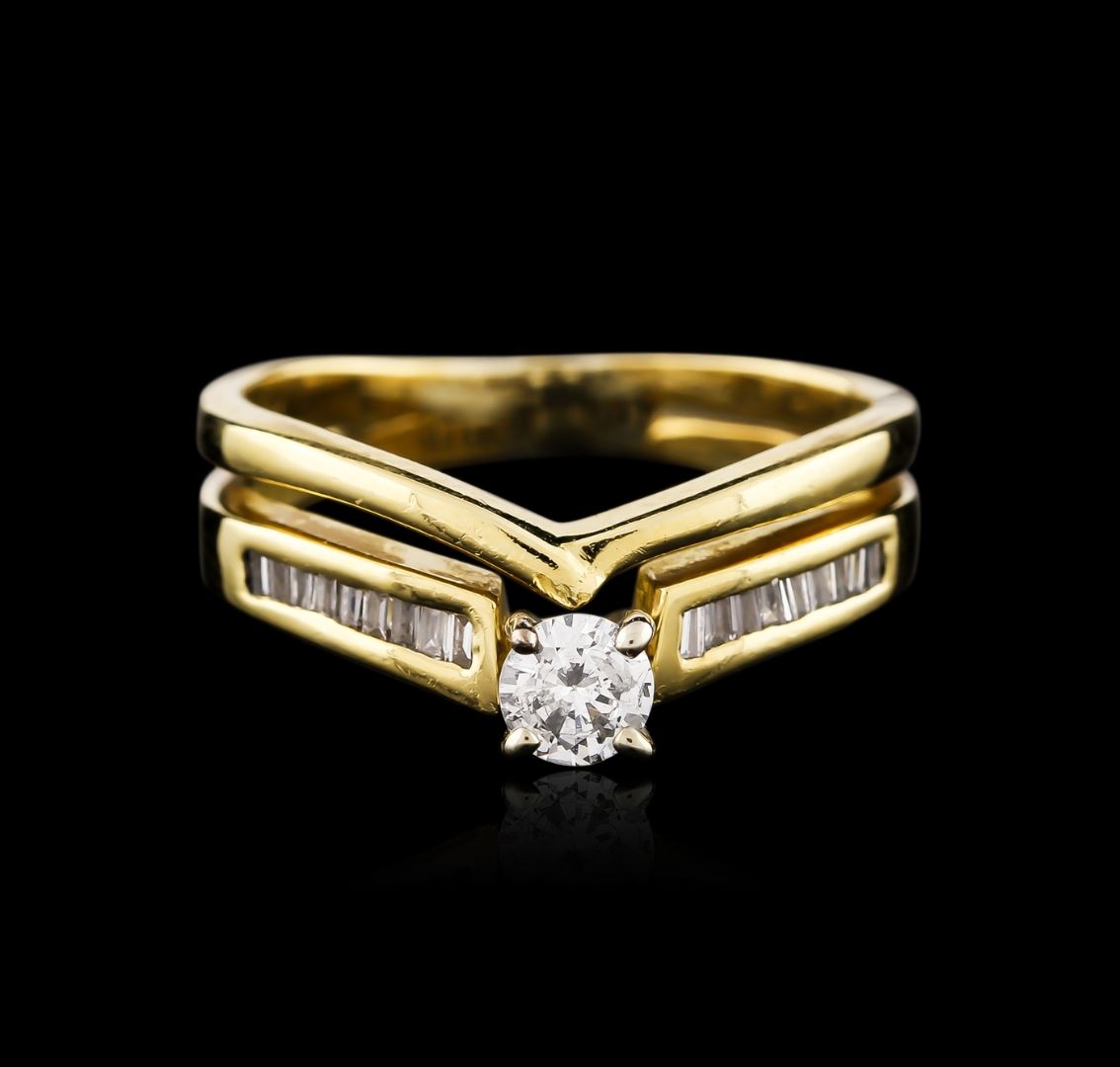 One wedding ring set featuring: 14KT yellow gold weighing 5.10 grams containing one center diamonds with a total weight of 0.20ct and baguette cut diamonds with a total weight of 0.14ct.