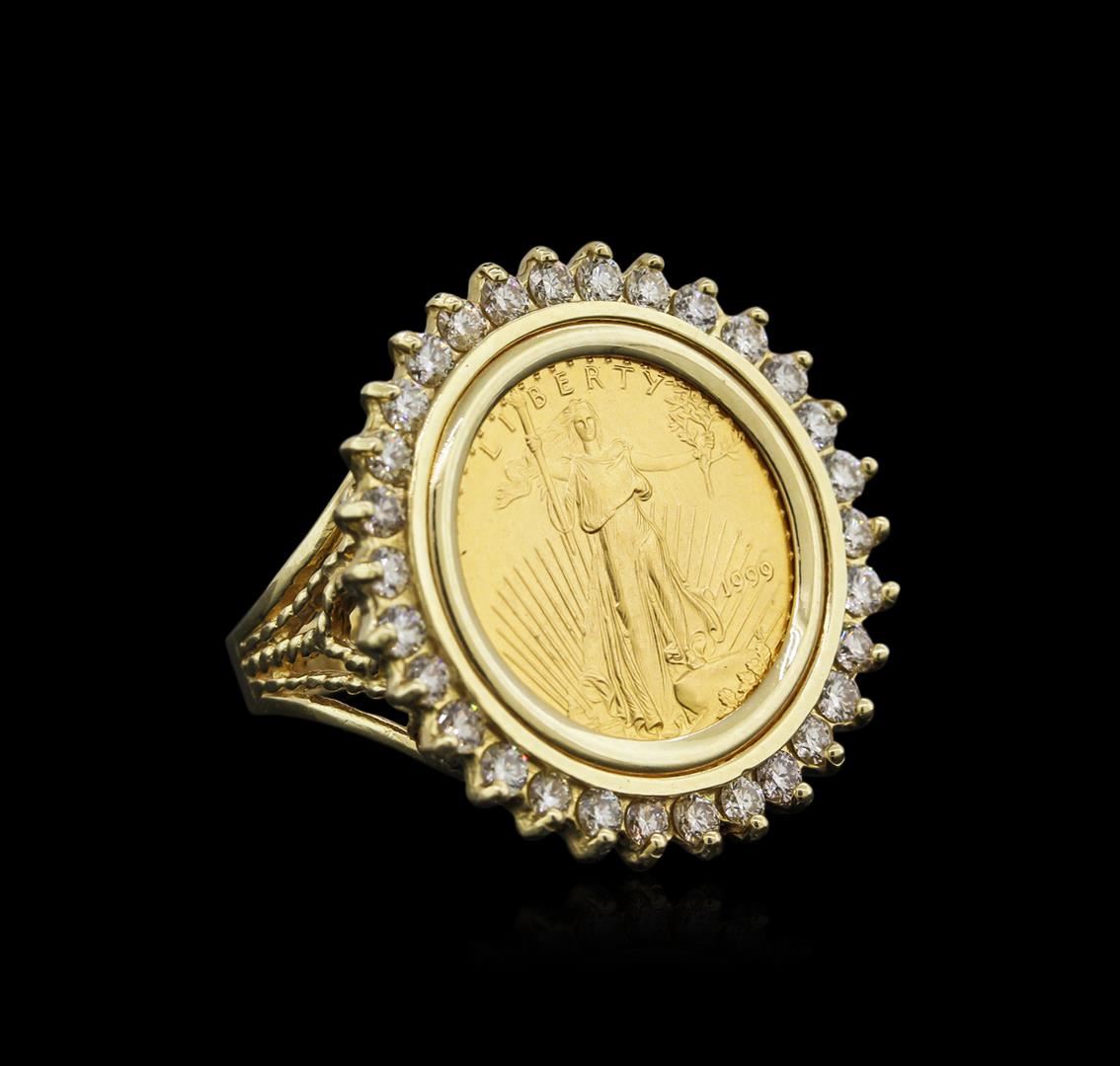 One electronically tested 14KT yellow gold mens cast 1/10oz $5 1999 coin diamond ring with a bright polish finish. Identified with markings of "14K". Condition is new. Containing: Thirty prong set round brilliant cut diamonds, measuring 1.50 - 1.50 x 0.90mm (depth est.) approximate total weight of 30 Stones = 0.37ct. Clarity: SI-1 to I-1. Color: L - M, Cut is Good. Diamonds are graded in the mounting, unless otherwise stated. Total Weight of Diamonds 0.37ct. Total Weight of Diamond Ring 9.00 grams. GGL Appraised at $1,980.00.