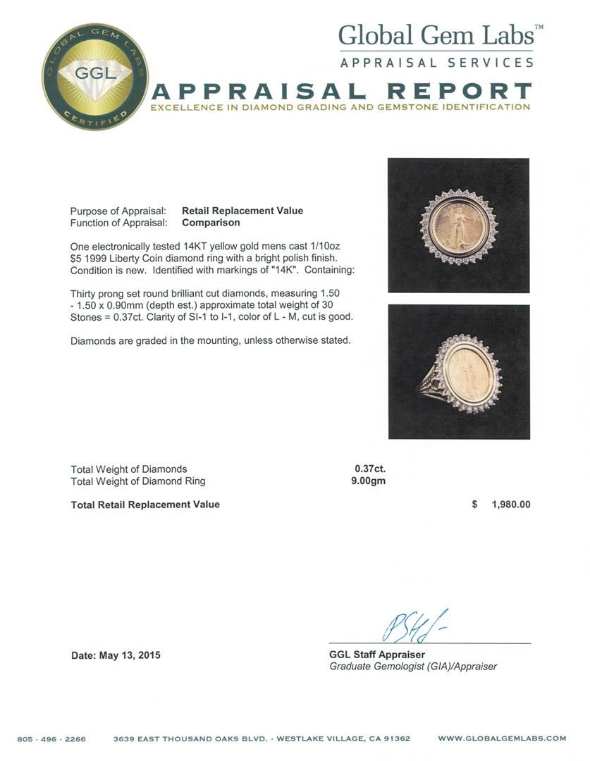 One electronically tested 14KT yellow gold mens cast 1/10oz $5 1999 Liberty Coin diamond ring with a bright polish finish. Identified with markings of "14K". Condition is new. Containing: Thirty prong set round brilliant cut diamonds, measuring 1.50 - 1.50 x 0.90mm (depth est.) approximate total weight of 30 Stones = 0.37ct. Clarity: SI-1 to I-1. Color: L - M, Cut is Good. Diamonds are graded in the mounting, unless otherwise stated. Total Weight of Diamonds 0.37ct. Total Weight of Diamond Ring 9.00 grams. GGL Appraised at $1,980.00.