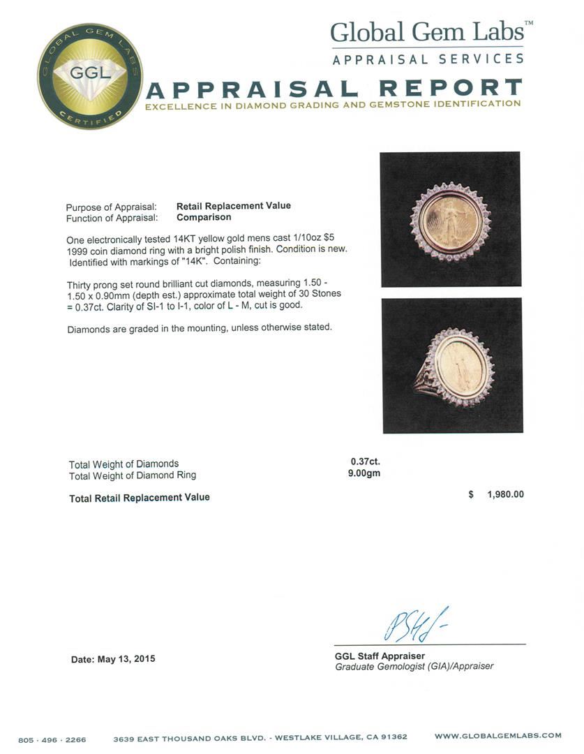 One electronically tested 14KT yellow gold mens cast 1/10oz $5 1999 coin diamond ring with a bright polish finish. Identified with markings of "14K". Condition is new. Containing: Thirty prong set round brilliant cut diamonds, measuring 1.50 - 1.50 x 0.90mm (depth est.) approximate total weight of 30 Stones = 0.37ct. Clarity: SI-1 to I-1. Color: L - M, Cut is Good. Diamonds are graded in the mounting, unless otherwise stated. Total Weight of Diamonds 0.37ct. Total Weight of Diamond Ring 9.00 grams. GGL Appraised at $1,980.00.