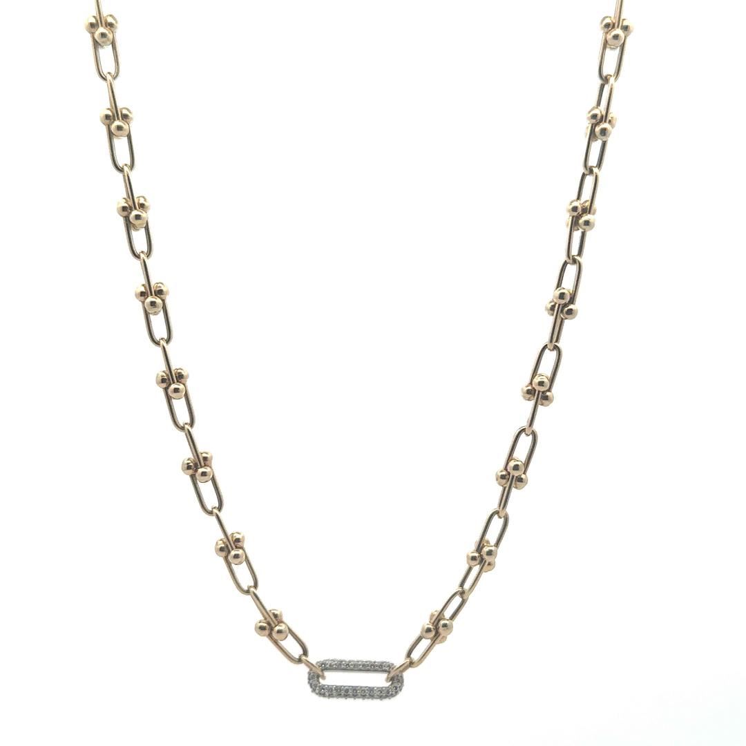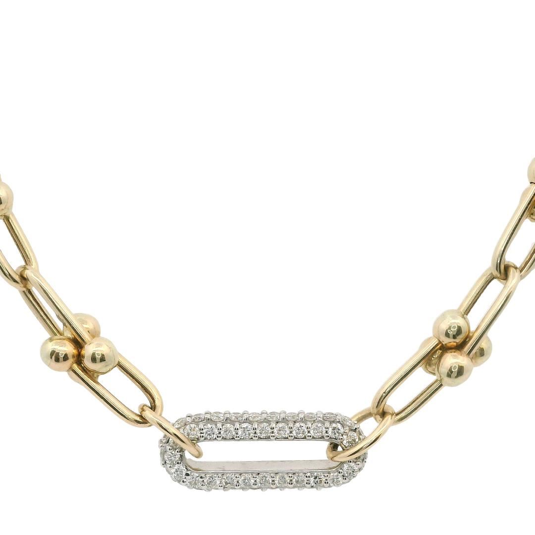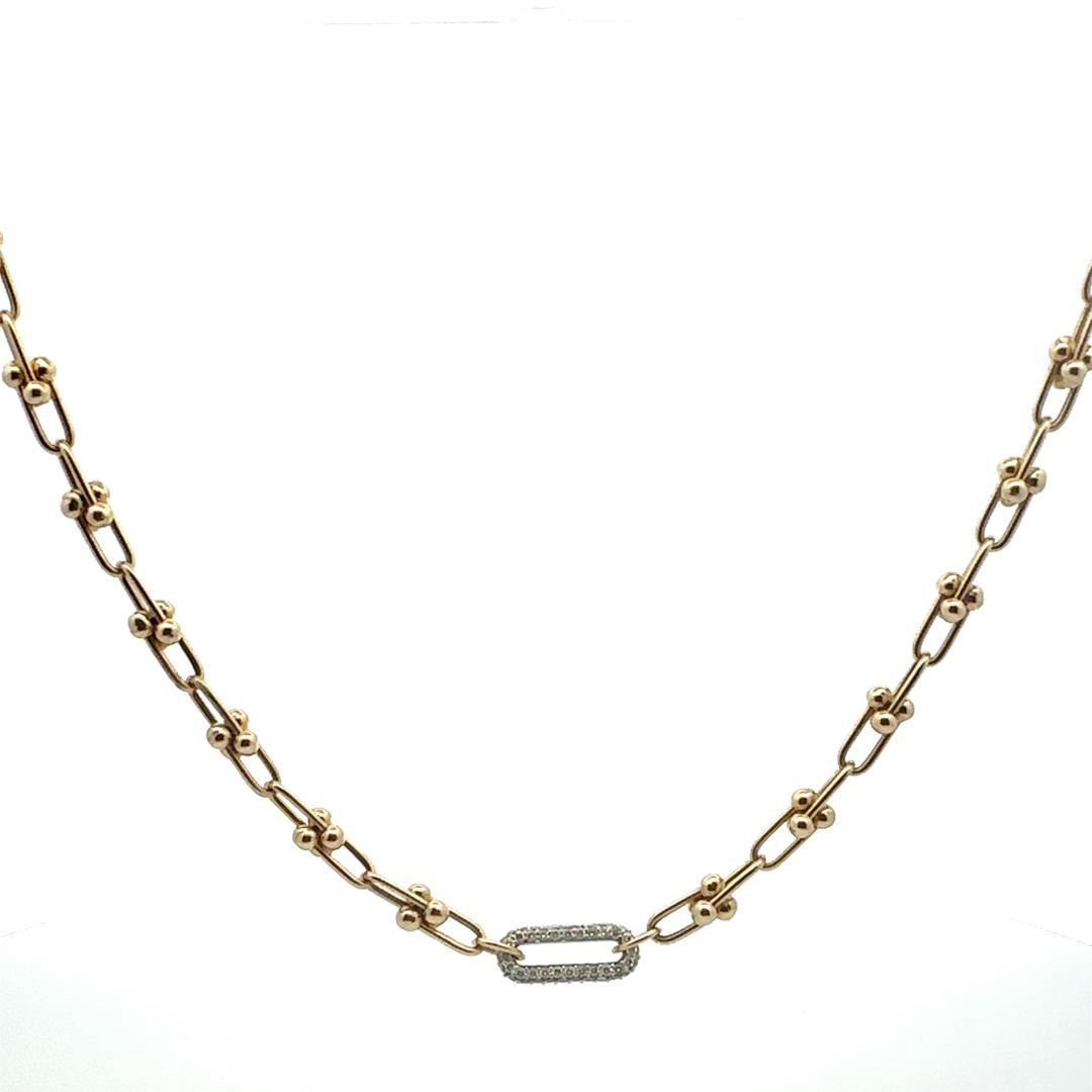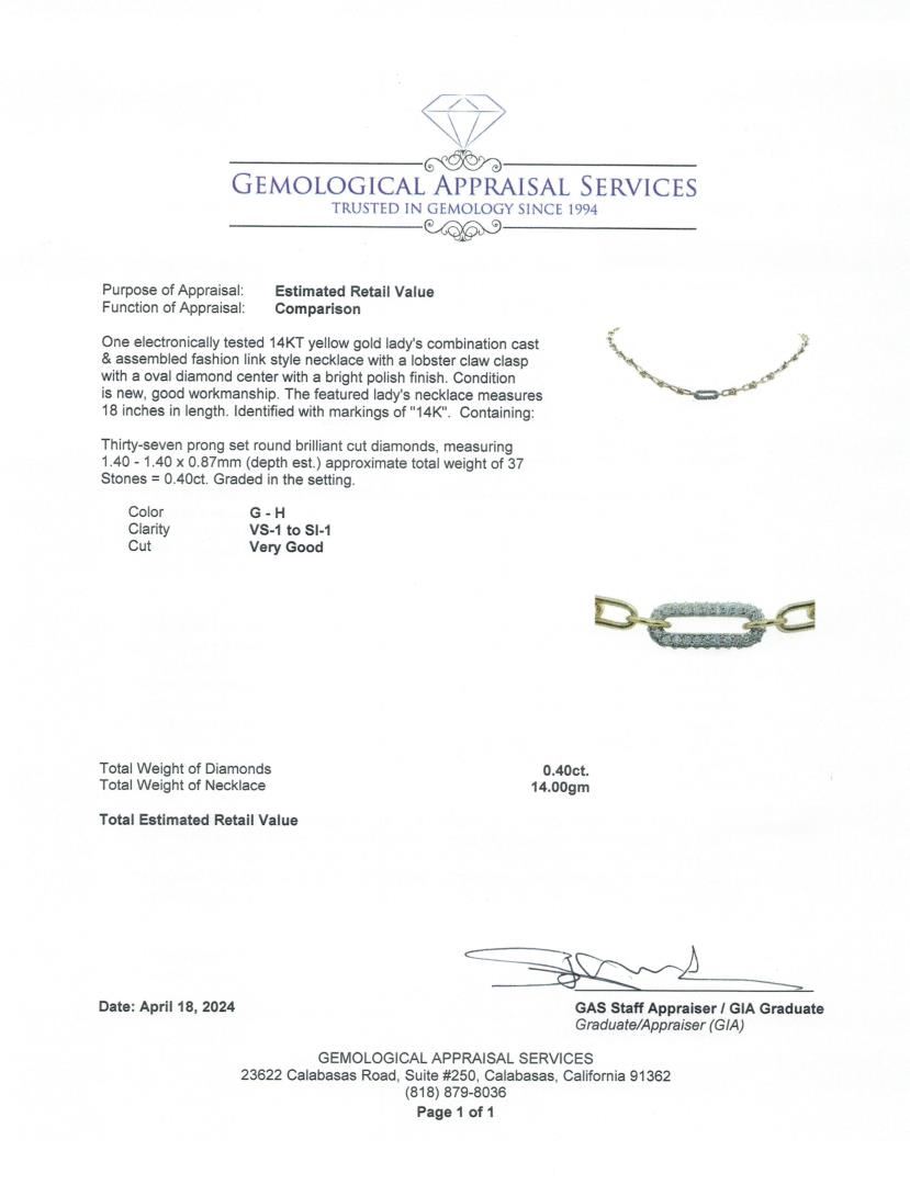 One electronically tested 14KT yellow gold lady's combination cast & assembled fashion link style necklace with a lobster claw clasp with a oval diamond center with a bright polish finish. Condition is new, good workmanship. The featured lady's necklace m GAS Appraised.