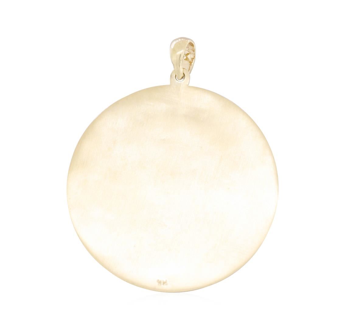 One disc pendant with two bell motifs featuring: 14KT yellow gold weighing 16.9 grams containing two cultured pearls, rubies weighing 0.40ctw and sapphires weighing 0.35ctw.