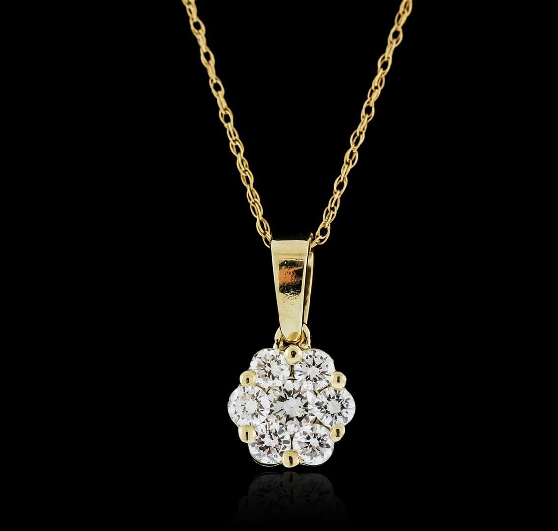 One pendant with chain featuring: 14KT yellow gold weighing 0.88 grams containing prong set round diamonds with a total weight of 0.41ct.