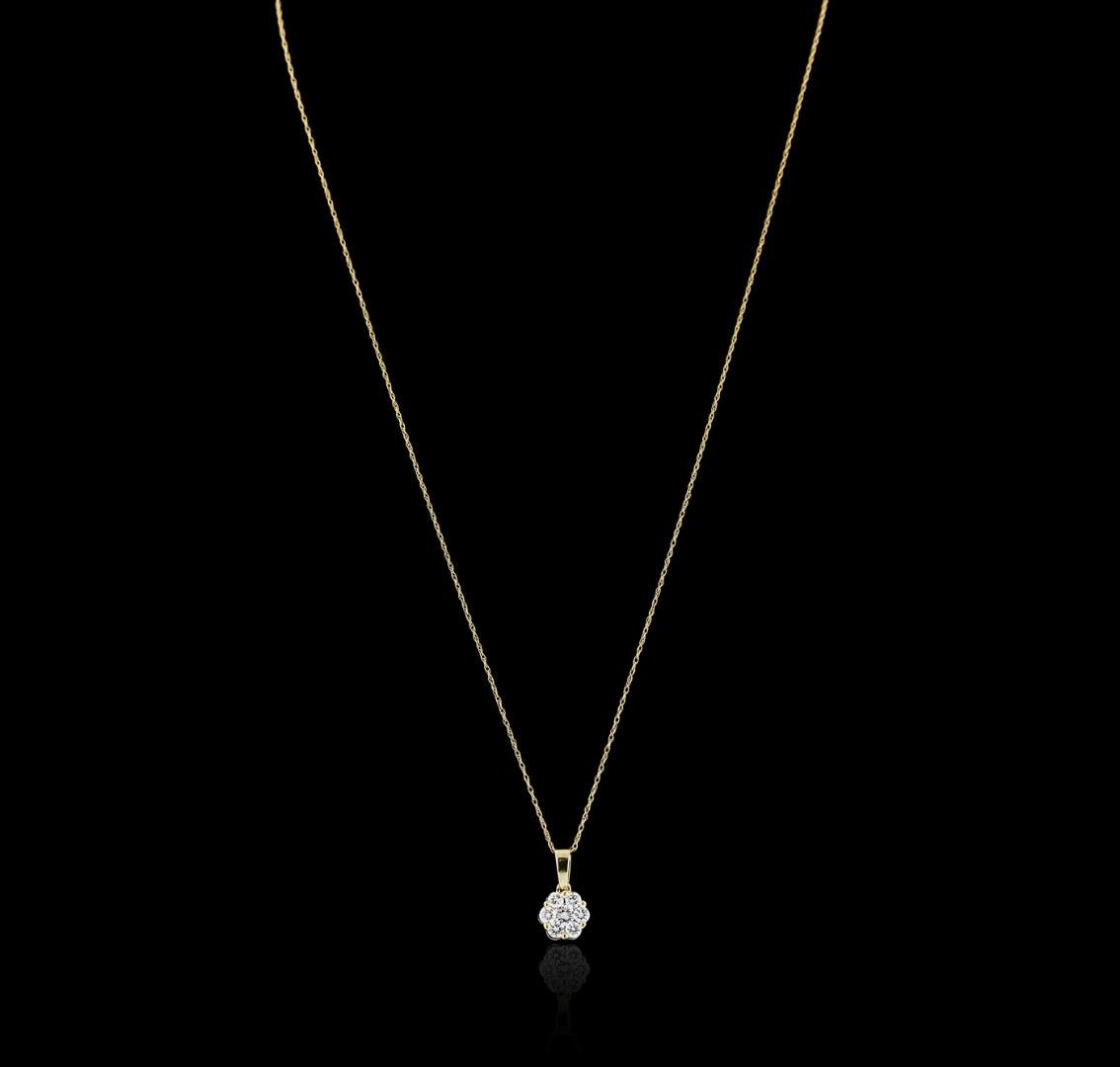 One pendant with chain featuring: 14KT yellow gold weighing 0.88 grams containing prong set round diamonds with a total weight of 0.41ct.