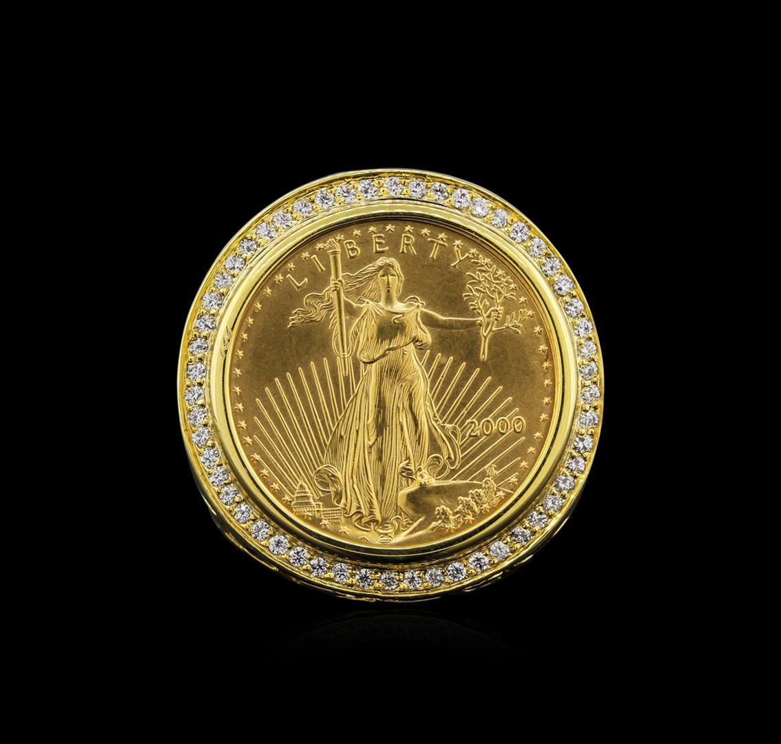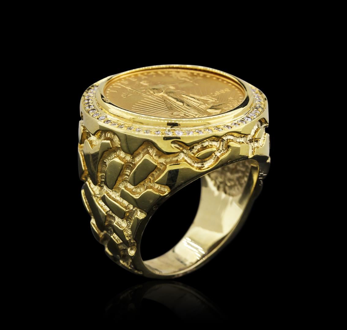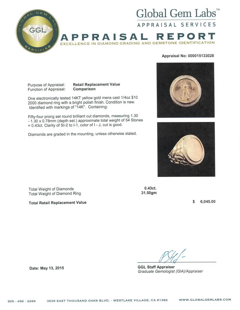 One electronically tested 14KT yellow gold mens cast 1/4oz $10 2000 diamond ring with a bright polish finish. Identified with markings of "14K". Condition is new. Containing: Fifty-Four prong set round brilliant cut diamonds, measuring 1.30 - 1.30 x 0.78mm (depth est.) approximate total weight of 54 Stones = 0.43ct. Clarity: SI-2 to I-1. Color: I - J, Cut is Good. Diamonds are graded in the mounting, unless otherwise stated. Total Weight of Diamonds 0.43ct. Total Weight of Diamond Ring 31.50 grams. GGL Appraised at $6,045.00.
