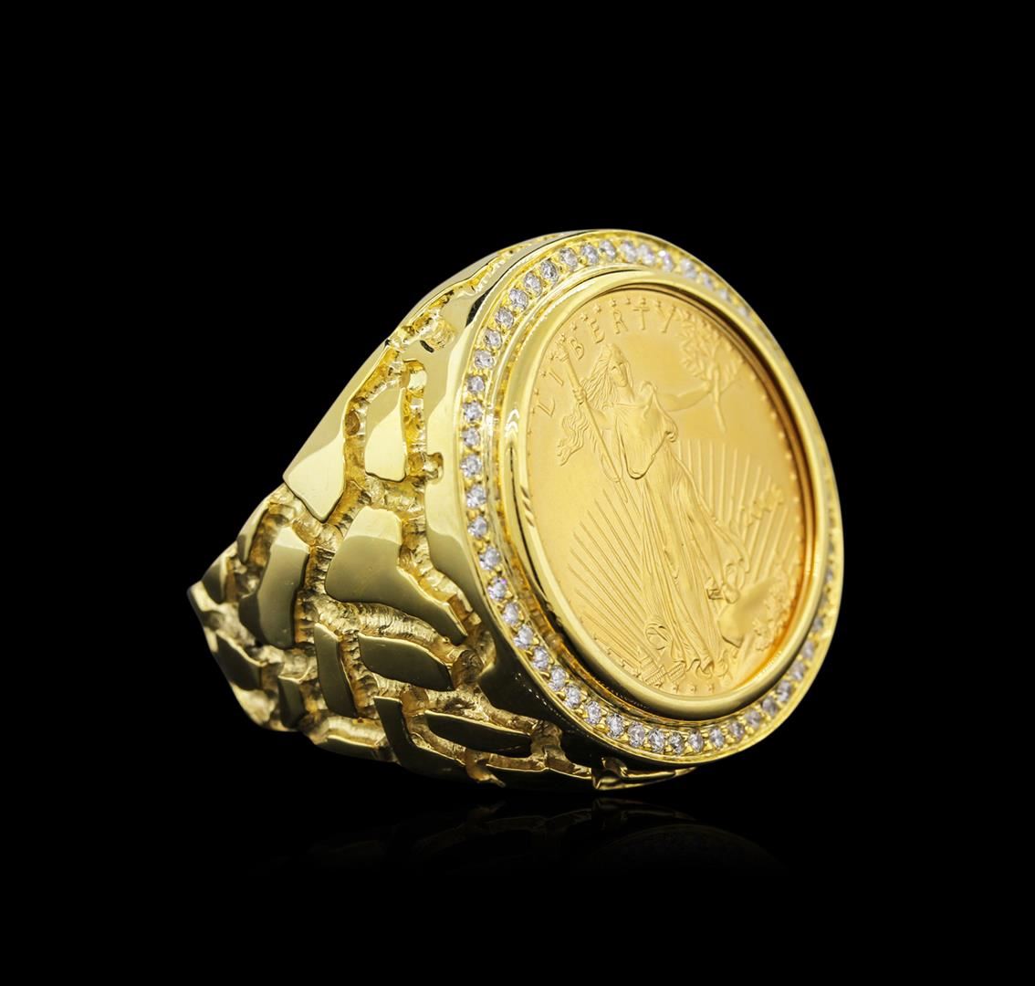 One electronically tested 14KT yellow gold mens cast 1/4oz $10 2000 diamond ring with a bright polish finish. Identified with markings of "14K". Condition is new. Containing: Fifty-Four prong set round brilliant cut diamonds, measuring 1.30 - 1.30 x 0.78mm (depth est.) approximate total weight of 54 Stones = 0.43ct. Clarity: SI-2 to I-1. Color: I - J, Cut is Good. Diamonds are graded in the mounting, unless otherwise stated. Total Weight of Diamonds 0.43ct. Total Weight of Diamond Ring 31.50 grams. GGL Appraised at $6,045.00.