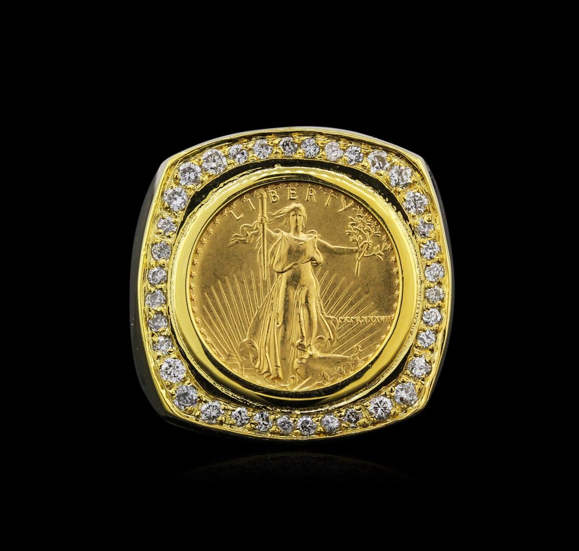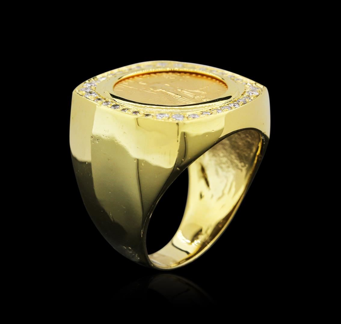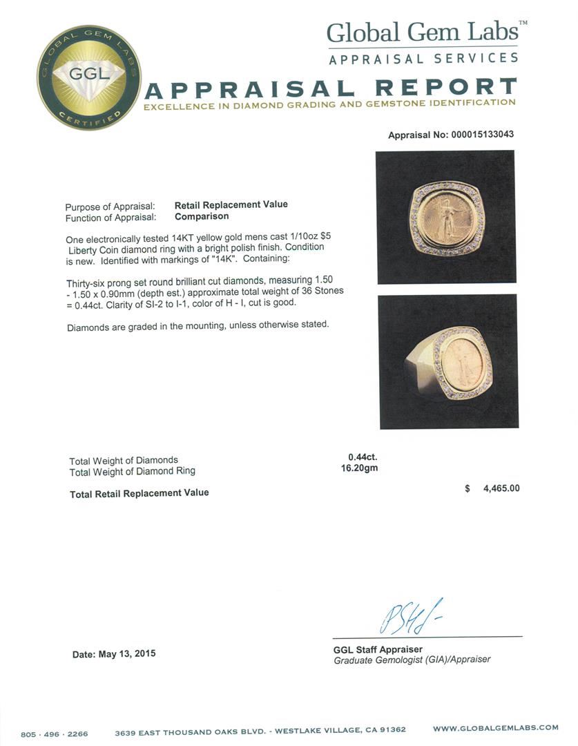 One electronically tested 14KT yellow gold men's cast 1/10oz $5 Liberty Coin diamond ring with a bright polish finish. Identified with markings of "14K". Condition is new. Containing: Thirty-Six prong set round brilliant cut diamonds, measuring 1.50 - 1.50 x 0.90mm (depth est.) approximate total weight of 36 Stones = 0.44ct. Clarity: SI-2 to I-1. Color: H - I, Cut is Good. Diamonds are graded in the mounting, unless otherwise stated. Total Weight of Diamonds 0.44ct. Total Weight of Diamond Ring 16.20 grams. GGL Appraised at $4,465.00.